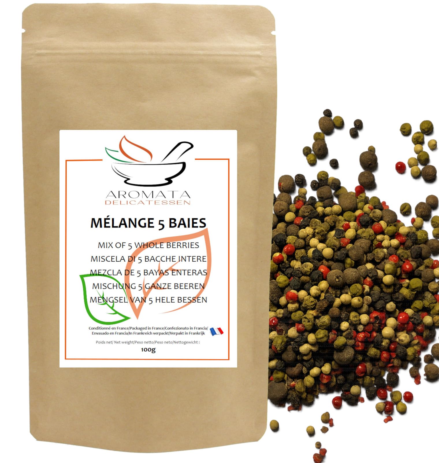 AROMATA – Mélange 5 Baies – Entiers – Poivre Noir, Blanc, Vert, Jamaïque Baies Roses – Idéal Moulin – 100 g