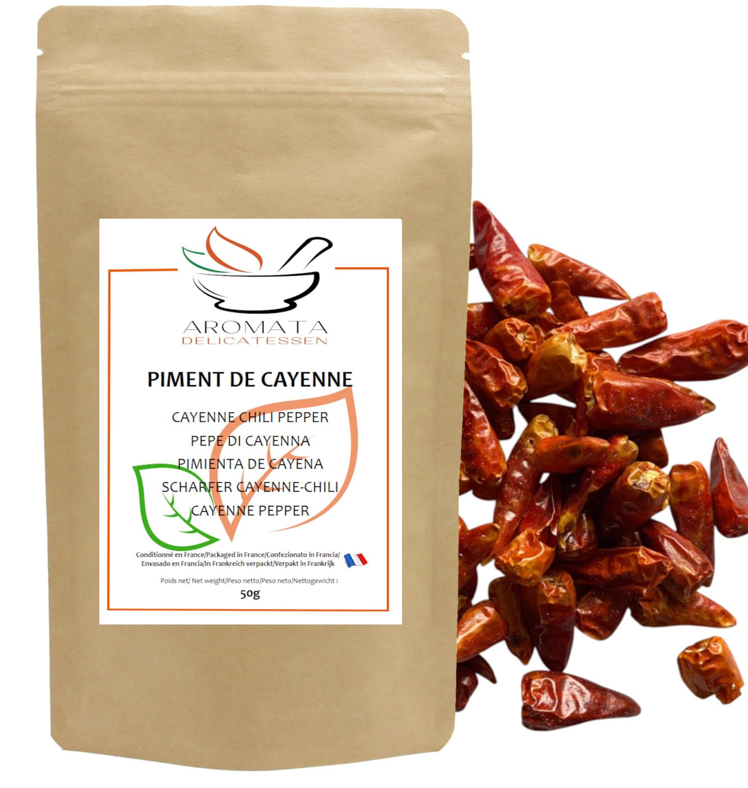 : Whole Cayenne Pepper Bird's Eye Chili Pepper in a resealable kraft paper bag. Net weight 50g. Natural and additive-free. Caution: Very hot, Scoville Heat Index 40,000. Level 8 to 9 10. Ingredients: Dried fruit of Capsicum annuum or Capsicum frutescens. Cayenne pepper is a hot and spicy chili pepper, native to South America. It is used in the preparation of Tabasco sauce, renowned for its heat. Directions for use: Ready to use, it is often used to add heat to dishes. It can be used whole in stews or sauces to flavor the dish without making it too spicy. For a more intense flavor, it can be crushed or ground into a powder. Recipe idea: Spicy roast chicken, or incorporate it into a spice mix to marinate the meat. Our whole Cayenne pepper is packaged in France. Aromata carefully selects its spices and herbs with the utmost attention to offer you exceptional quality. The resealable, opaque zip-lock bag protects your spices from moisture and light, preserving their full flavor. Ingredients: Whole Cayenne Pepper. Instructions: store in its original packaging. Reseal the bag tightly after use. See more?The resealable, opaque zip-lock bag protects your spices from moisture and light, preserving their full flavor. Our whole cayenne pepper is packaged in France. Aromata carefully selects its spices and herbs with the utmost attention to offer you exceptional quality. Recipe idea: Spicy roast chicken, or incorporate it into a spice mix to marinate the meat. Usage tip: Ready to use, it is often used to add heat to dishes. It can be used whole in stews or sauces to flavor the dish without making it too spicy. For a more intense use, it can be crushed or ground into a powder. The pepper capsules may split during shipping, so be sure to collect the seeds from the bottom of the bag! Ingredients: Dried fruits of Capsicum annuum or Capsicum frutescens. Cayenne pepper is a hot and spicy chili pepper, native to South America. It is used in the preparation of Tabasco sauce, renowned for its heat. Whole cayenne pepper in a resealable kraft paper bag. Net weight 50g. Natural and additive-free. Scoville rating 40,000. Heat level 8 to 9 out of 10.Description du produit Piment type Cayenne entier Langue d'oiseau en sachet kraft refermable. Poids net 50 gr. Naturel et sans additifs. Attention très fort ,Indice Scoville 40 000 . Degré 8 à 9 10 Ingrédients :Fruits séchés du Capsicum annum ou capsicum frutescens Le Piment de Cayenne est un piment fort et épicé, originaire d'Amérique du Sud. Il entre dans la préparation de la sauce Tabasco réputée pour son piquant Conseil d'utilisation : Prêt à l'emploi, il est souvent utilisé pour ajouter de la chaleur aux plats. On peut l'utiliser entier dans les plats mijotés ou les sauces pour parfumer le plat sans trop le pimenter. Pour une utilisation plus intense, on peut le broyer ou le réduire en poudre . Une idée recette : Le poulet rôti épicé , ou on l'incorpore dans un mélange d'épices pour mariner la viande. Notre Piment de Cayenne entier est conditionné en France . Aromata sélectionne soigneusement ses épices et aromates avec la plus grande attention afin de vous offrir une qualité exceptionnelle. LE SACHET REFERMABLE par zip, opaque, protège vos épices de l'humidité et de la lumière leur conservant ainsi toute leur faculté gustative. Ingrédients Piment de Cayenne entier P.when('A').execute(function(A) { A.on('a:expander:toggle_description:toggle:collapse', function(data) { window.scroll(0, data.expander. expander[0].offsetTop-100) }) }) Mode d'emploi A conserver dans son emballage d'origine. Bien refermer le sachet après utilisation. Voir plus?LE SACHET REFERMABLE par zip, opaque, protège vos épices de l'humidité et de la lumière leur conservant ainsi toute leur faculté gustative. Notre Piment de Cayenne entier est conditionné en France . Aromata sélectionne soigneusement ses épices et aromates avec la plus grande attention afin de vous offrir une qualité exceptionnelle. Une idée recette : Le poulet rôti épicé , ou on l'incorpore dans un mélange d'épices pour mariner la viande. Conseil d'utilisation : Prêt à l'emploi, il est souvent utilisé pour ajouter de la chaleur aux plats. On peut l'utiliser entier dans les plats mijotés ou les sauces pour parfumer le plat sans trop le pimenter. Pour une utilisation plus intense, on peut le broyer ou le réduire en poudre . Les capsules des piments peuvent se fendre au cours de l'expedition, surtout pensez à recupérer les graines au fond du sachet !. Ingrédients :Fruits séchés du Capsicum annum ou capsicum frutescens Le Piment de Cayenne est un piment fort et épicé, originaire d'Amérique du Sud. Il entre dans la préparation de la sauce Tabasco réputée pour son piquant. Piment type Cayenne entier en sachet kraft refermable. Poids net 50 gr. Naturel et sans additifs. Indice Scoville 40 000 . Degré 8 à 9 10 .AROMATA – Piment de Cayenne entier – Piment fort entier séché - Langue d'oiseau 50 gr