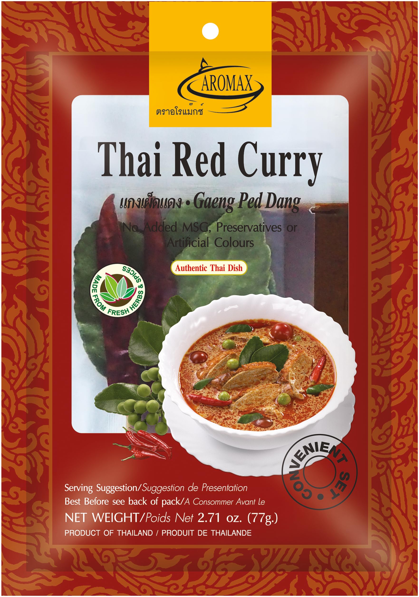Aromax - Red Curry Spice Mix - Pack of 6 (6 x 77g) Preparation: Heat the oil, add the green curry paste and heat gently (1 min). Add the meat and cook. Dissolve the coconut milk powder in hot water and add it. Add water and vegetables and bring to a boil. Enjoy with fish sauce, served hot. Ingredients: Coconut extract, lemongrass, maltodextrin, chili (9.7 ), salt, garlic, onion, galangal, depilatory paste (shrimp, water), lime peel, cumin, coriander, lime leaves - 05 07. INGREDIENTS Ingredients: Coconut milk powder (coconut extract, water), lemongrass, maltodextrin, chili 9 , salt, garlic, chestnuts, spice mix (lime leaf powder, black cumin, nigella powder, coriander powder), coffee leaves, galangal, SHRIMPS paste, salt. May contain traces of fish, pits, seeds, and soy. INSTRUCTIONS Serves 4: 1 packet Aromax Red Curry Mix (coconut milk powder, dried herbs, red curry paste), 200g chicken, 60g eggplant or cherry tomatoes, 300ml water, 3 plates, cooking oil. Preparation: Heat the oil, add the green curry paste and heat gently (1 min). Add the chicken and cook. Dissolve the coconut milk powder in hot water and add it to the pot. Add water and vegetables and bring to a boil. Enjoy as desired with fish sauce serve hot. See moreAromax Lot de 6 boîtes de mélange d'épices pour curry rouge (6 x 77 g)DESCRIPTION DU PRODUIT DESCRIPTION DU PRODUIT Aromax - Mélange d'épices pour curry rouge - Lot de 6 (6 x 77 g) Préparation : chauffer l'huile, ajouter de la pâte au curry verte et chauffer à basse température (1 min). Ajoutez la viande et cuisinez. Dissoudre la poudre de lait de noix de coco dans l'eau chaude et ajoutez-le. Ajouter de l'eau et des légumes et faire bouillir. Savourer à volonté avec de la sauce à poisson, servir à chaud. Ingrédients : extrait de noix de coco, citronnelle, maltodextrine, piment (9,7 ), sel, ail, oignon, galgant, pâte à épiler (crevettes, eau), coque de citron vert, cumin, coriandre, feuilles de citron vert - 05 07. INGRÉDIENTS Ingrédients : poudre de lait de noix de coco (extrait de noix de coco, eau), citronnelle, maltodextrine, piment 9 , sel, ail, châottes, mélange d'épices (poudre de feuilles de citron vert, bol de café en poudre de nigelle de cumin, poudre de coriandre) feuilles de café, galgant, pâte SHRIMPS, sel. Peut contenir des traces de poisson, de noyaux, de semences et de soja. MODE D'EMPLOI Ingrédients pour 4 personnes : 1 paquet de mélange Aromax pour curry rouge (poudre de lait de noix de coco, herbes séchées, pâte curry rouge), 200 g de poulet, 60 g d'aubergines ou de cherry tomates, 300 ml d'eau, 3 assiettes. Huile alimentaire. Préparation : chauffer l'huile, ajouter de la pâte au curry verte et chauffer à basse température (1 min). Ajoutez la viande et cuisinez. Dissoudre la poudre de lait de noix de coco dans l'eau chaude et ajoutez-le. Ajouter de l'eau et des légumes et faire bouillir. Savourer à volonté avec de la sauce à poisson, servir à chaud. Voir plus