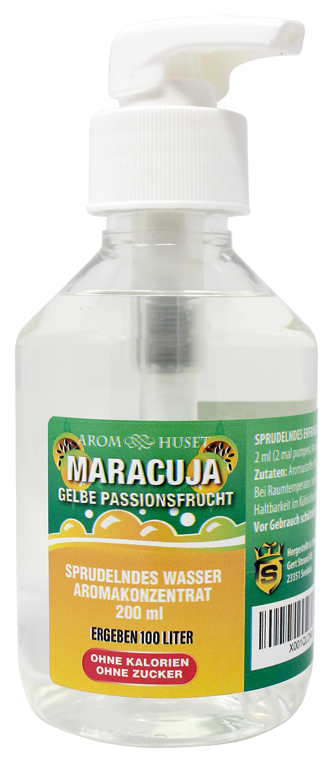 Our Maracuja (yellow passion fruit) concentrate helps you incorporate more flavorful, calorie-rich foods into your daily life. During the summer months, staying hydrated is essential. Maracuja (yellow passion fruit) concentrate transforms mineral water into a delicious, refreshing, sparkling beverage in seconds. 100 liters of Maracuja (yellow passion fruit) flavored beverage. Your benefits: Maracuja (yellow passion fruit) beverage anytime. Compatible with SodaStream and other carbonation systems. Sugar-free. Calorie-free. Very fruity flavor without saccharin, cyclamate, aspartame, or similar sweeteners. Low carbohydrate content. Preservative-free. Mixing ratio 1:500. A refreshing thirst quencher for hot summer days. You save plastic and protect the environment. No more hauling it. No bottle deposit. No empty product. Made in Sweden. Sugar-free fruit drink: Dosage: Use 2 ml, approximately ½ teaspoon of concentrate per liter of water. Ingredients: Flavorings, glycerin, distilled water. Nutritional information per 100 ml, prepared according to the following instructions: Energy 0 kJ 0 kcal, Carbohydrate 0 g (of which sugars 0 g), Fat 0 g, Protein 0 g, Salt 0 g. Store in the refrigerator at room temperature or for extended shelf life.Le concentré de maracuja 200 ml donne 100 litres d'eau gazeuse fruit de la passion jaune pour gazéificateurs d'eau sans sucre zéro calories arôme très concentré, rapport : 1:500DESCRIPTION DU PRODUIT Notre concentré de Maracuja (fruit de la passion jaune) aide à intégrer une alimentation calorique avec plus de goût dans votre vie quotidienne. Pendant les mois d'été, il faut prendre suffisamment de liquide. Le concentré de maracuja (fruit de la passion jaune) transforme l'eau minérale en une délicieuse boisson rafraîchissante pétillante en quelques secondes. 100 litres de boisson au goût maracu (fruit de passois jaune). Vos avantages : Boisson maracuja (fruit de la passion jaune) à tout moment. Utilisable avec SodaStream et autres machines à gazéifier Sans sucre. Sans calories. Goût très fruité sans saccharine, cyclamate, aspartame ou édulcorants similaires. Faible teneur en glucides. Sans conservateurs. Rapport de mélange 1:500. Extincteur de soif rafraîchissant pendant les chaudes journées d'été. Vous économisez du plastique et protégez l'environnement. Plus besoin de le remorquer. Pas de consigne de bouteille. Pas de produit vide. Fabriqué en Suède. Boisson à fruits sans sucre : Dosage : Utilisez 2 ml, environ ½ cuillère à café de concentré par litre d'eau. Ingrédients : Arômes, glycérine, eau distillée. Informations nutritionnelles pour 100 ml, préparées selon les instructions suivantes : Énergie 0 kJ 0 kcal, glucides 0 g (dont sucre 0 g), graisses 0 g, protéines 0 g, sel 0 g. Conserver dans le réfrigérateur à température ambiante ou pour une durée de vie prolongée.
