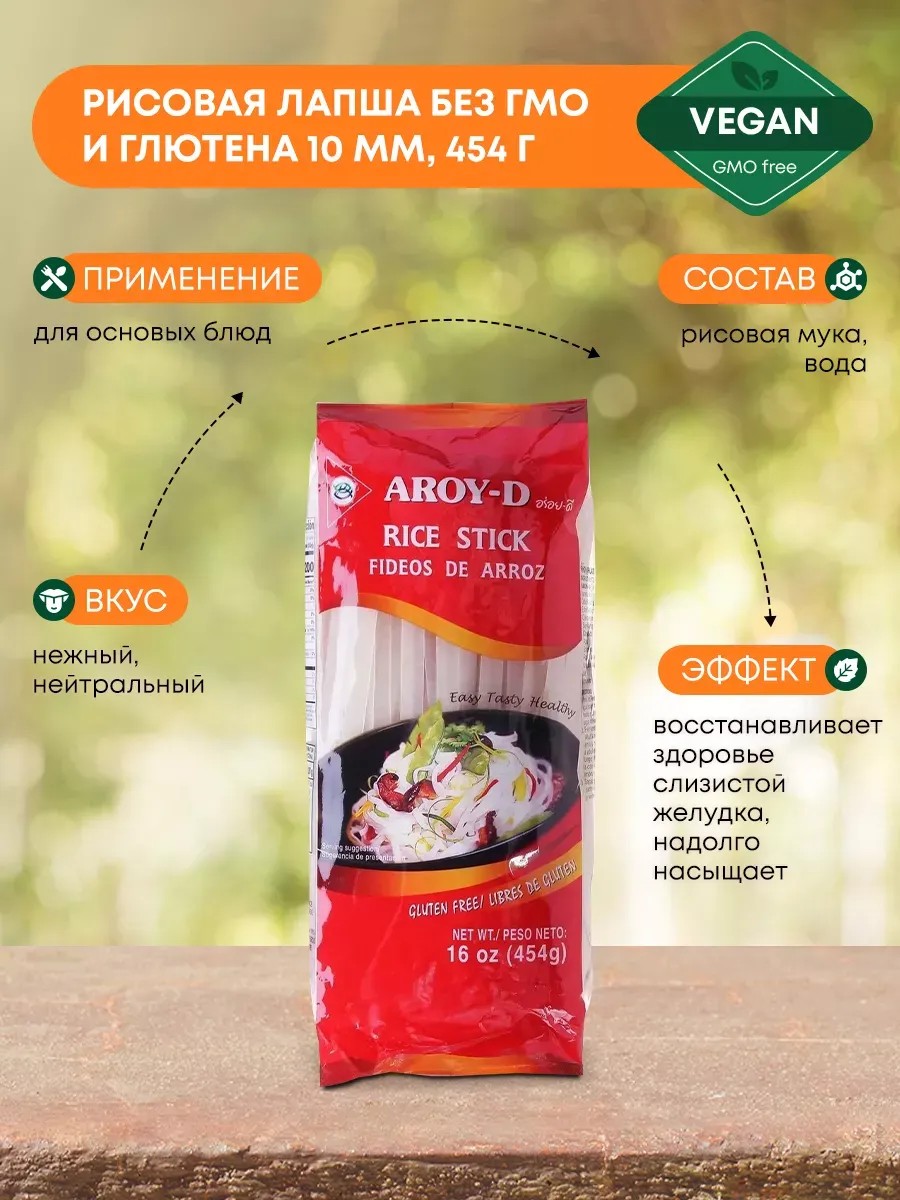 Рисовая лапша 10мм из Азии 454г|Rice noodles Aroy-Dкрайне популярна на Востоке, и используется для готовки огромного числа кушаний, за счёт нежного нейтрального вкуса и эстетичного внешнего вида. Она отлично подходит к блюдам из рыбы и мяса в качестве гарнира, может добавляться к овощам и морепродуктам, обжариваться в соусах, тушиться и т.д.