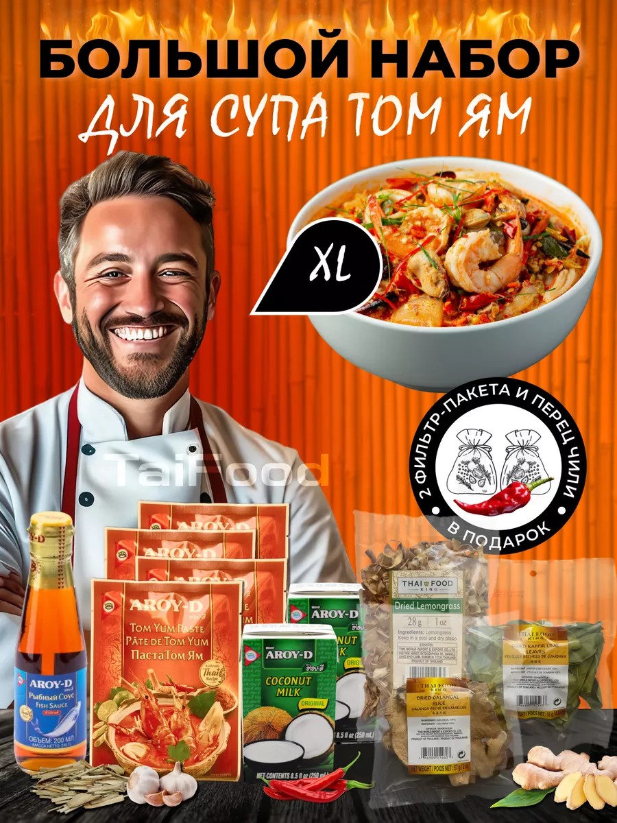 | Состав | Кокосовое молоко Aroy-D - 2*250 мл; Рыбный соус Aroy-D - 200 мл; Сушеные листья каффрского лайма - 10 гр; Лемонграсс -28 гр; Галангал сушеный резаный - 57 гр; перец чили; фильтр пакет - 2 шт; Паста Том Ям Aroy-D - 4*50 гр |