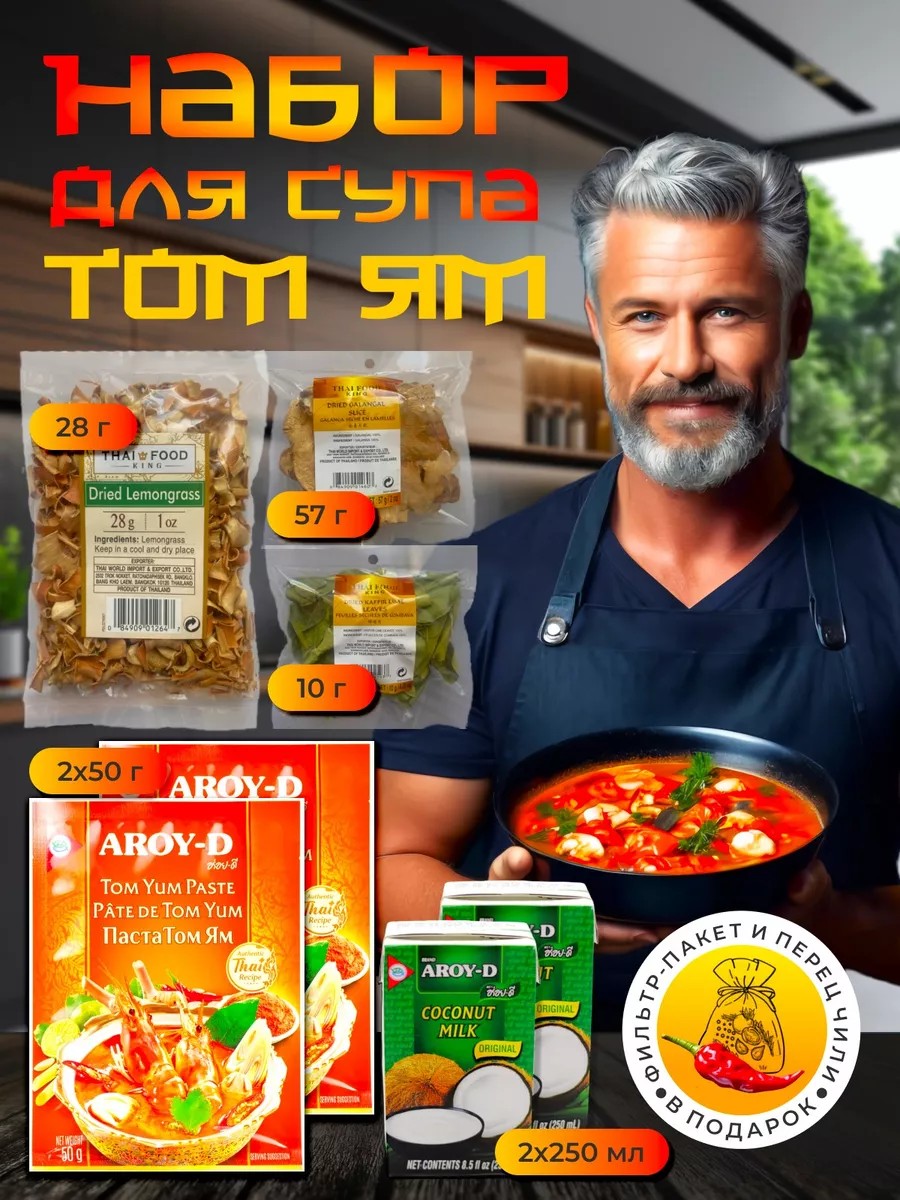 КомплектацияПаста Том Ям AROY-D 50 гр - 2 шт; Кокосовое молоко AROY-D - 2 шт.; Лимонное сорго - 28 грамм; Листья каффрского лайма - 10 гр; паста том яма; галангал - 57 грамм