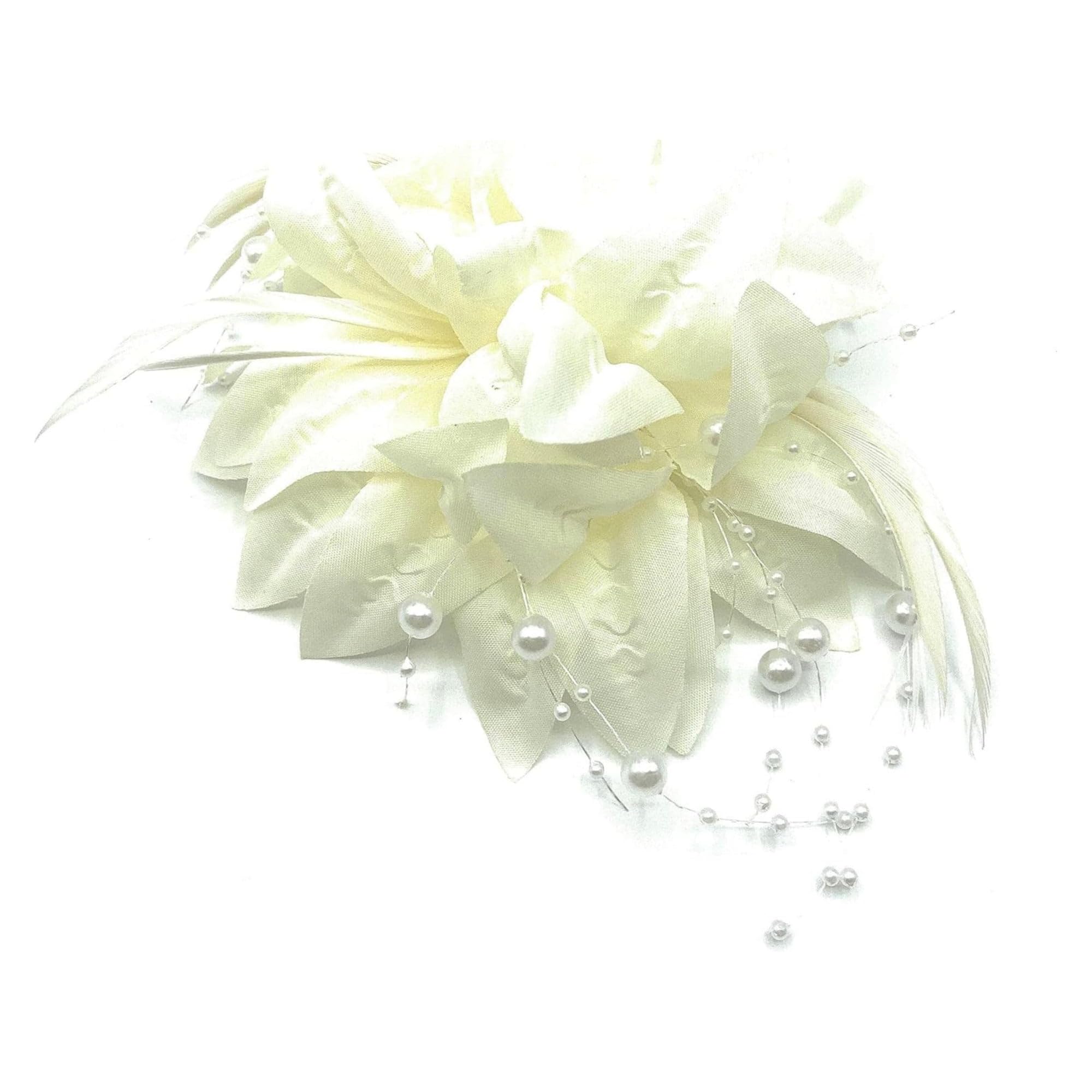 Approximately 15cm across. Stunning flower hair fascinator corsage & brooch for weddings ladies day the races & all your special events!. Some have described the colour as being more of a cream or off-white. As it has a 'beak and clip' fitting so can be worn either as a fascinator or used to accessorise clothing / handbag. This beautiful white fascinator is lightweight with petals, feathers, and pearl beading.
