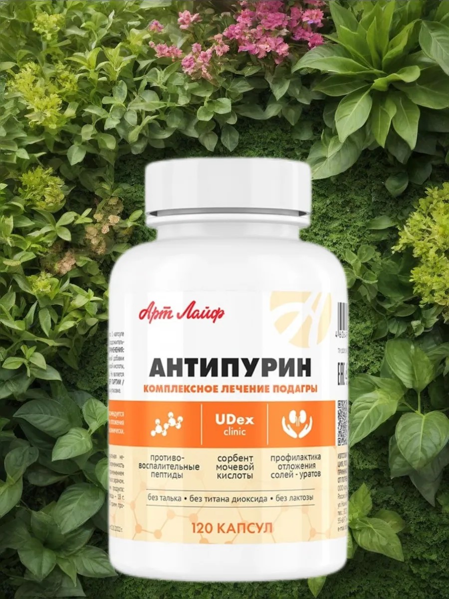 Antipurine is a unique combination of the selective uric acid sorbent "UDex", the anti-inflammatory component "Oligopeptan", martinia (devil's claw), boswellia and licorice extracts, which has a synergistic effect to correct elevated uric acid levels, as well as for the prevention and comprehensive treatment of gout.