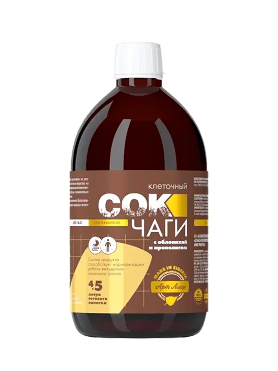 Сок Чаги клеточный с облепихой и прополисом. Поддерживает работу желудочно-кишечного тракта. Сок чаги клеточный приготовленный по особой UTM-технологии. Экстракт чаги обладает спазмолитическим и мочегонным свойством, за счет чего и понижает артериальное и венозное давление, уменьшает частоту пульса. Экстракт чаги обладает гипогликемическим действием. Чага обладает спазмолитическими мочегонными антимикробными репаративными свойствами. Нормализует деятельность желудочно-кишечного тракта и кишечную микрофлору, способствует рубцеванию язв желудка и двенадцатиперстной кишки. Проявляет выраженные гастропротективные свойства. Облепиха используется при язве желудка, болезнях кишечника, авитаминозе и дизентериях. Плоды применяются в качестве поливитаминного средства при пониженной кислотности, запоре, плохом обмене веществ. Обладает ранозаживляющем и регенерирующим свойствами. Прополис оказывает бактерицидное, противогрибковое действие и обладает противовоспалительными, биостимулирующими, противоопухолевыми, антиоксидантными и обезболивающими свойствами. Научно доказано, что прополис является активным лечебным средством, стимулирующим специфические и неспецифические факторы иммунитета. Прополис стимулирует регенерацию тканей. Применять. В качестве общеукрепляющего средства при физических и эмоциональных нагрузках. Для профилактики обострений заболеваний желудочно-кишечного тракта и в комплексной терапии заболеваний ЖКТ. При кожных заболеваниях, вызванных различными воспалительными процессами ЖКТ, печени, желчевыделительной системы. Для профилактики возникновения злокачественных образований