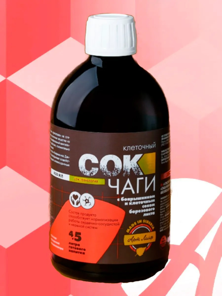 Сок Чаги клеточный с боярышником и соком березового листа. Нормализует работу сердечно-сосудистой и нервной систем. Сок чаги клеточный приготовленный по особой UTM-технологии. Эта технология извлекает из самого «сердца» клетки активные полисахаридные комплексы производные лупана. Бетулин и птерин. Бетулиновые кислоты и тритерпены органические гуминоподобные кислоты. Это обеспечивает продукту выраженное общеукрепляющее действие, которое проявляется в мобилизации защитных сил организма, поддержке иммунитета, увеличении антиоксидантного потенциала, благоприятном влиянии на обмен веществ. Полезные свойства чаги усилены клеточным соком березового листа и боярышника. Напиток оказывает физиологически благоприятное воздействие на состояние сердечно-сосудистой и нервной систем и обладает антиоксидантным и адаптогенным действием. Экстракт чаги обладает спазмолитическим и мочегонным свойством, за счет чего и понижает артериальное и венозное давление, уменьшает частоту пульса. Также экстракт чаги обладает гипогликемическим действием. Лист березы стимулирует метаболические процессы в организме, очищает кровь от шлаков и токсинов, действует как мочегонное, что приводит к потере жидкости — по этим причинам его используют при сердечных и почечных отеках. Боярышника плоды оказывают сосудорасширяющее действие, приносят пользу свойством тонизировать сердечную мышцу, обеспечивать достаточное поступление кислорода. Снижают частоту, устанавливают ритм, увеличивают силу сердечных сокращений. Уменьшают возбудимость сердца, снимают его утомление, улучшают коронарный кровоток, мозговое кровообращение. Оказывают седативное (успокаивающее, но без наступления сонливости) действие, снижают возбудимость нервной системы, способствуют устранению бессонницы, помогают нормализовать сон.Применять. В качестве общеукрепляющего средства При нарушении обмена вещест. Для профилактики и сопутствующего лечения гипертонии I и II стадий, вегетососудистой дистонии по гипертоническому типу. При атеросклерозе стенокардии нарушении сердечного ритма. В комплексной терапии неврозов депрессии стрессе бессоннице беспокойном сне. При сильной сонливости днем, тревожных состояниях, астено-невротических состояниях. Для профилактики возникновения злокачественных образований