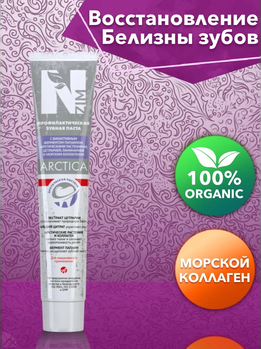 Лечебно-профилактическая зубная паста N-Zim Arctiсa мягко расщепляет зубной налет, восстанавливает природную белизну зубов, укрепляет зубную эмаль и ткани десен. Экстракт цетрарии восстанавливает природную белизну зубов, препятствует размножению бактерий, вызывающих кариес. Кальция цитрат укрепляет эмаль. Экстракт шишки укрепляет зубную эмаль, способствует защите от кариеса, насыщает ткани десен полезными веществами. Экстракт морошки питает ткани десен, благодаря содержанию большого количества макро- и микроэлементов. Обладает антиоксидантными и регенерирующими свойствами. Ламинария богата микроэлементами, в частности органическим йодом, который придает зубной пасте антисептические свойства. Фитогормоны и витамины стимулируют регенерацию слизистой оболочки полости рта. Также ламинария обладает кровоостанавливающим свойством. Экстракт арктической ивы останавливает кровотечение, смягчает зубную боль. Источник витамина С. Морской коллаген укрепляет десна и предотвращает развитие пародонта. Фермент папаин мягко расщепляет зубной налет. Все эти растительные компоненты при ежедневном использовании обеспечат вашим зубам надежный уход и свежее дыхание.