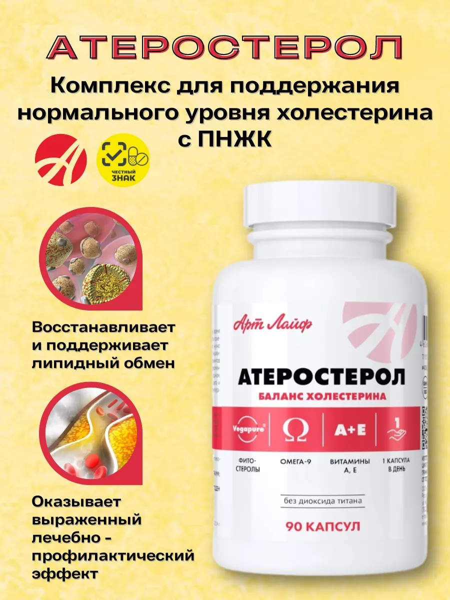Атеростерол от Арт Лайф - комплекс для поддержания нормального уровня холестерина с ПНЖК, витамином Е и Бета-каротином.