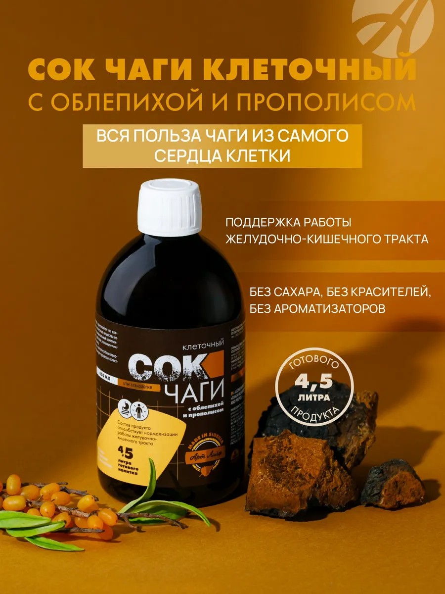 | Состав | Сок чаги клеточный; сорбат калия (консервант); сок облепиховый; экстракт прополиса |