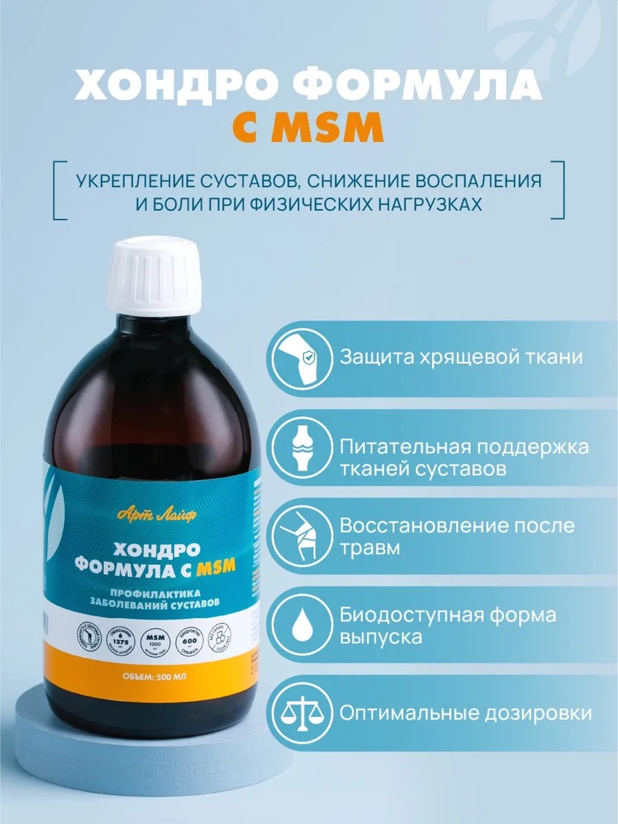 ChondroFormula with MSM is a powerful new-generation liquid chondroprotector for the protection and restoration of joints, cartilage, and ligaments during sports activities, arthrosis, arthritis, osteochondrosis, and age-related changes.