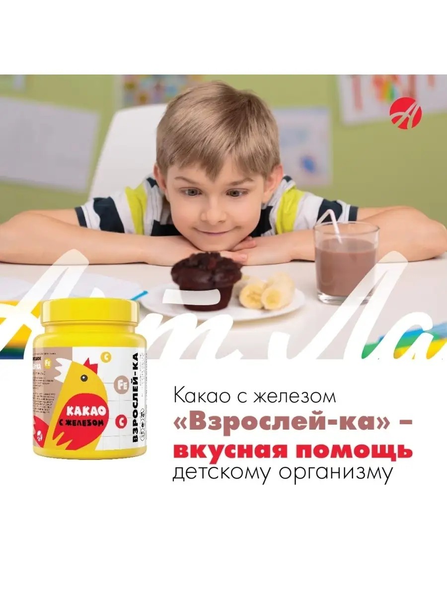 Какао Взрослей-ка с железом, 400 гПолезный напиток с насыщенным шоколадным вкусом. Дополнительный источник железа и витамина С. Поможет легко и эффективно сбалансировать детский рацион. Какао Взрослейка с железом имеет насыщенный шоколадный вкус без металлического привкуса, так как содержит железо пирофосфорной кислоты. Данная соль без вкуса и запаха, является высокоустойчивым соединением, не взаимодействует с кислотами желудка и остается стабильной до всасывания в кишечнике. Витамин С, входящий в состав какао,способствует адекватному усвоению железа, укрепляет иммунитет. Какао способствует полноценному росту и развитию ребенка, повышает общую сопротивляемость организма и выносливость.