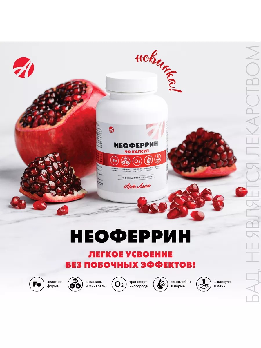 БАД с уникальной хелатной формой железа и витаминным комплексом для поддержания здоровья организма. Неоферрин обеспечивает эффективное усвоение железа благодаря его бисглицинатной форме, в сочетании с витамином C, витаминами группы B (B6, B9, B12), медью и марганцем. Этот сбалансированный комплекс помогает нормализовать уровень гемоглобина, улучшить транспорт кислорода к клеткам и устранить признаки анемии.