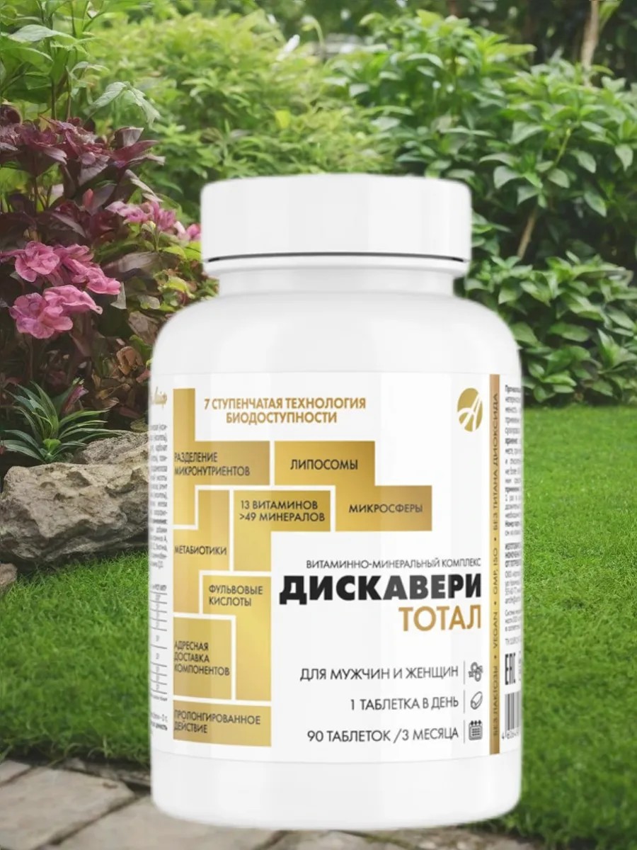 Дискавери ТОТАЛ – это новый уровень в эволюции витаминно-минеральных комплексов. При создании продукта были использованы прогрессивные технологические возможности производства, а также учтены механизмы действия витаминов, их биохимические превращения в организме, межвитаминные отношения. «Дискавери тотал» содержит полный спектр нутриентов и помогает качественно устранять дефицитные состояния. Он обеспечивает адресную доставку компонентов, обладает максимальной биодоступностью и эффективностью. Технология медленного высвобождения позволяет поддерживать в крови нужную концентрацию нутриентов без скачков и перепадов. Физиологические дозировки делают формулу БАД универсальной для мужчин и женщин. Комплекс является вегетарианским продуктом, не содержит лактозу, молочный белок, титана диоксид. 1 банка «Дискавери тотал» рассчитана на полный рекомендованный курс приема – 3 месяца.