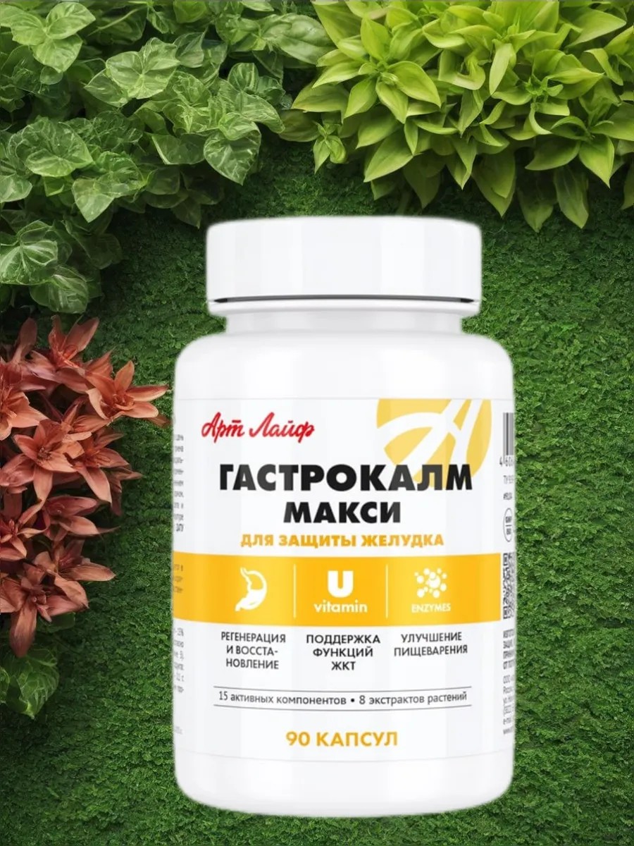 Гастрокалм Макси - это биологически активный комплекс растительных экстрактов, ферментов и антацидного компонента. Содержит пробиотики для кишечника взрослому. Способствует заживлению язвенных и эрозивных поражений слизистой желудка и двенадцатиперстной кишки. Благодаря антацидным свойствам гастрокам эффективен в комплексной терапии заболеваний ЖКТ с повышенной кислотностью, что проявляется в значительном ослаблении диспепсических и болевых ощущений. Ферменты улучшают пищеварение и способствуют лучшему усвоению питательных веществ, помогает от вздутия. Комплекс обладает спазмолитическим, противовоспалительным и противомикробным действием. Используется от гастрита и для восстановления ЖКТ. Способствует улучшению моторики желудочно-кишечного тракта и восстановлению нормальной микрофлоры кишечника. Способ применения: Взрослым по 1 капсуле 3 раза в день во время еды. Продолжительность приема 1 месяц.