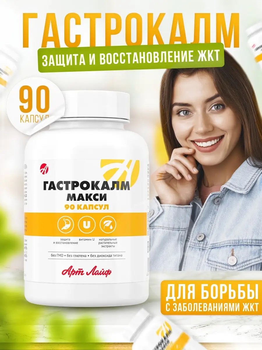 Gastrocalm Maxi Ulcers Diarrhea Stomach Constipation Gastritis Pancreatitis Dysbacteriosis Artlife. Gastrocalm Maxi is a biologically active complex of plant extracts, enzymes, and an antacid component. It promotes the healing of ulcerative and erosive lesions of the gastric and duodenal mucosa. Thanks to its antacid properties, it is effective in the complex treatment of gastrointestinal diseases with high acidity, which is manifested by a significant reduction in dyspeptic and pain sensations. Enzymes improve digestion and promote better absorption of nutrients. The complex has antispasmodic, anti-inflammatory, and antimicrobial effects. It helps improve gastrointestinal motility and restore normal intestinal microflora. Indications: Diseases of the digestive system - gastritis, gastroduodenitis, peptic ulcers, erosions. Diseases associated with impaired fermentation and digestion – dysbacteriosis, enterocolitis, ulcerative colitis, irritable bowel syndrome, diarrhea, constipation. Prevention of relapses of chronic gastrointestinal diseases. Prevention of oncological pathologies of the gastrointestinal tract, various intoxications due to smoking and drug addiction. Pancreatitis, reflux, cholecystitis. Radiation and chemotherapy, conditions accompanied by somatic disorders, general weakness, parenteral nutrition. Liver disease, hepatitis, cholelithiasis, impaired glucose tolerance, dyslipidemia. Benefits: Improves the healing of erosive lesions of the gastrointestinal tract. Protects against the aggressive effects of irritants (hydrochloric acid, pepsin), reduces pain. Promotes better digestion, thanks to a complex of enzymes. Has antibacterial activity without causing an imbalance of microflora. Ingredients: Vitamin U (methylmethionine sulfonium chloride), magnesium oxide, magnesium carbonate, propolis, chaga extract, flax (seeds), plantain (leaf), cetraria extract, valerian extract, dill (fruit), aloe vera extract, licorice root extract, papain, bromelain, beta-carotene. Excipients: carriers: lactose, microcrystalline cellulose, grindstead alginate; silicon dioxide (anti-caking agent). DIRECTIONS FOR USE: Adults take 1 capsule 3 times daily with meals. Duration of treatment: 1 month.