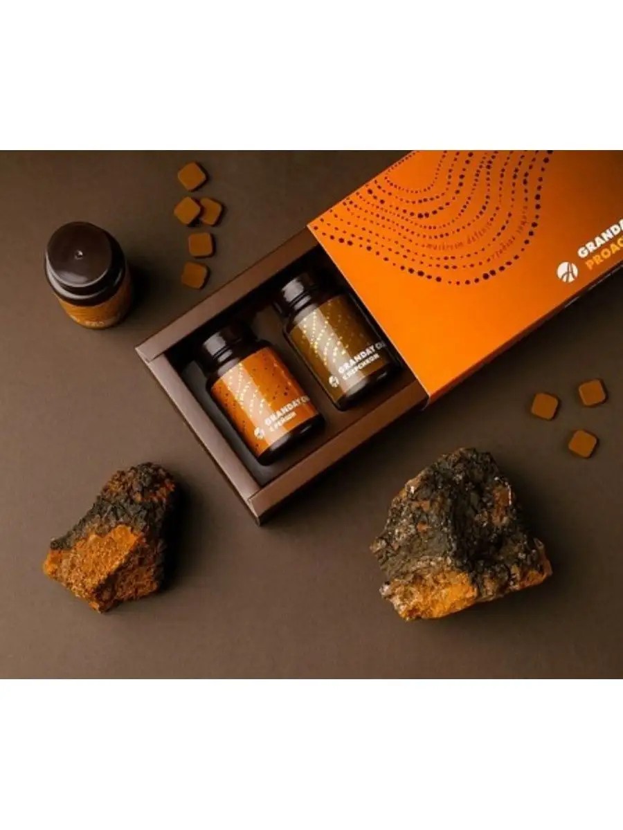 The comprehensive daily program Granday Chaga Proactive Art Life includes three unique complexes: immune correction, energy support, and antioxidant protection. Granday Chaga Concentrate with Cordyceps. Chaga with cordyceps extract and thyme is a "triple immune protection" formula with a prolonged effect. Each component of the drink fights inflammation, preventing the development of viral and other infections. This unique complex has a powerful tonic and immune-correcting effect. Granday Chaga Concentrate with Reishi. Chaga with reishi mushroom and ginger is a drink of youth and longevity. The combination of chaga with reishi extract and ginger is a powerful natural stimulant that initiates cell regeneration. Their combined action provides powerful antitumor, anti-inflammatory, antibacterial, anti-allergic, and antioxidant effects. Improves metabolism, prevents premature aging of the body. Concentrate "Granday chaga" with peach. Chaga with peach leaf extract and fir extract - a barrier to free radicals. The combination of chaga, peach leaf and fir - the strongest antioxidant protection for the body. The complex has a powerful vascular strengthening, antimicrobial and wound-healing effect. Granday chaga (Granday chaga) Art Life: composition. Chaga with cordyceps and thyme extract: chaga mushroom, chaga extract, cordyceps extract, thyme herb. Chaga with reishi and ginger: chaga mushroom, chaga extract, ginger, reishi mushroom. Chaga with peach leaf and Siberian fir extracts: chaga mushroom, chaga extract, peach extract, fir extract. Nutritional value (100 g dry product): Carbohydrates (polysaccharides) - 15 g. Energy value - 60 kcal, 251.2 kJ / g. Contraindications: individual intolerance to the components, childhood. Instructions for use. Pour 1 glass (200 ml) of boiling water over the briquette, brew for 5-7 minutes. It is recommended to drink GRANDAYCHAGA proactive three cups a day: morning, afternoon and evening. 1 package of GRANDAYCHAGA proactive is designed for 1.5 months of drinking the drink. The preventive course is 3-5 months, if necessary, the course is repeated after a 7-10-day break. Store at a temperature not exceeding 25 degrees, in a dry place, inaccessible to children. Shelf life: 1 year. Ingredients: Chaga with cordyceps and thyme extract: chaga mushroom, chaga extract, cordyceps extract, thyme herb. Chaga with reishi and ginger: chaga mushroom, chaga extract, ginger, reishi mushroom.