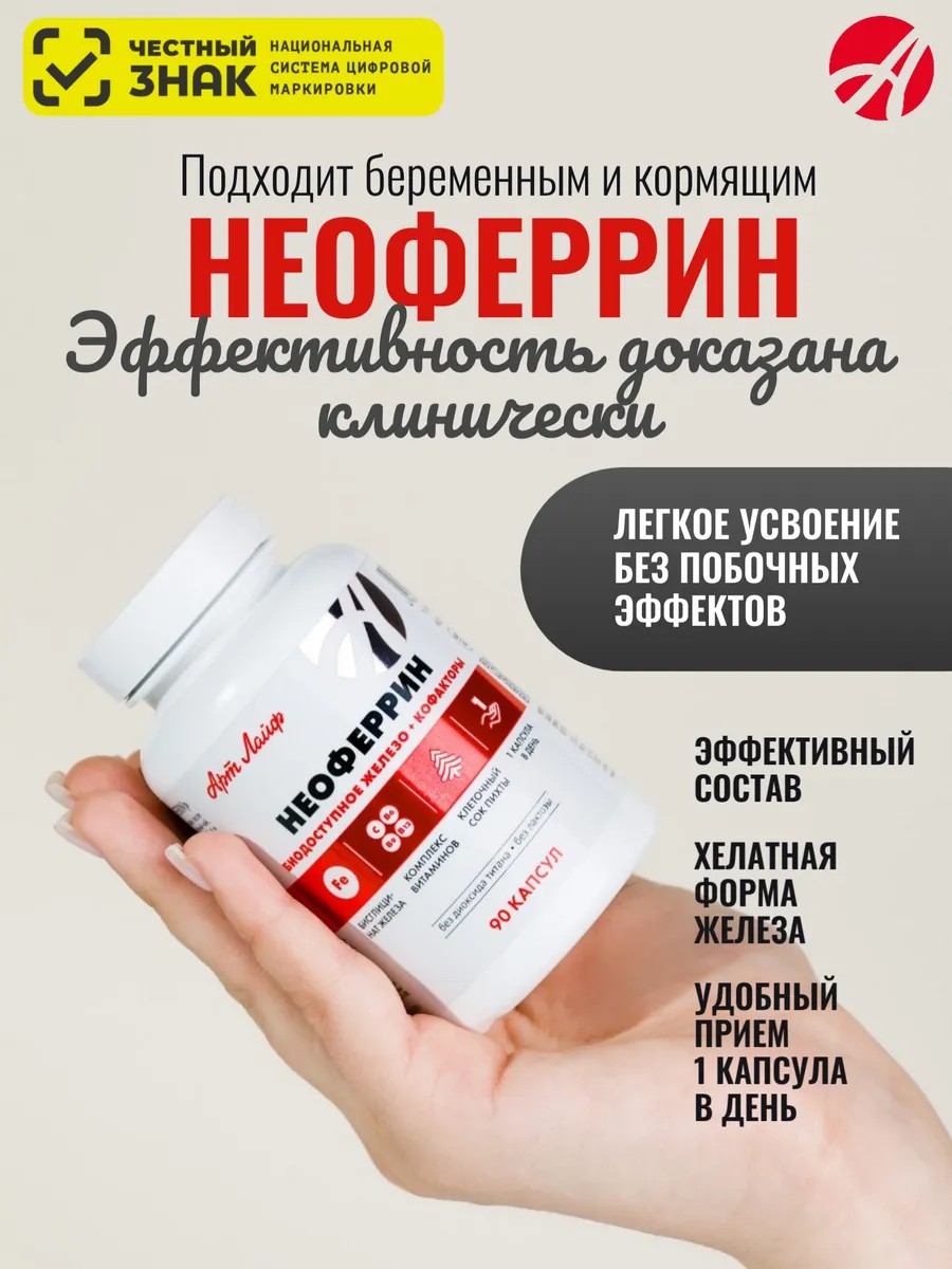БАД Неоферрин от Арт Лайф эффективен благодаря уникальному сочетанию железа в хелатной, биодоступной форме, железо-мальтольного комплекса важнейшего компонента клеточного сока пихты сибирской с медью, марганцем, аскорбиновой кислотой и витаминами группы B.