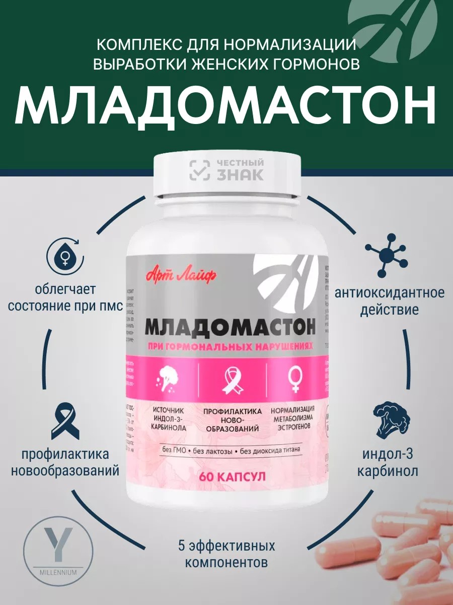Биологический комплекс «Младомастон» - капсулированный комплекс, способствует нормальному метаболизму эстрогенов, уменьшает риск развития новообразований, в том числе злокачественных (грудной железы, матки).