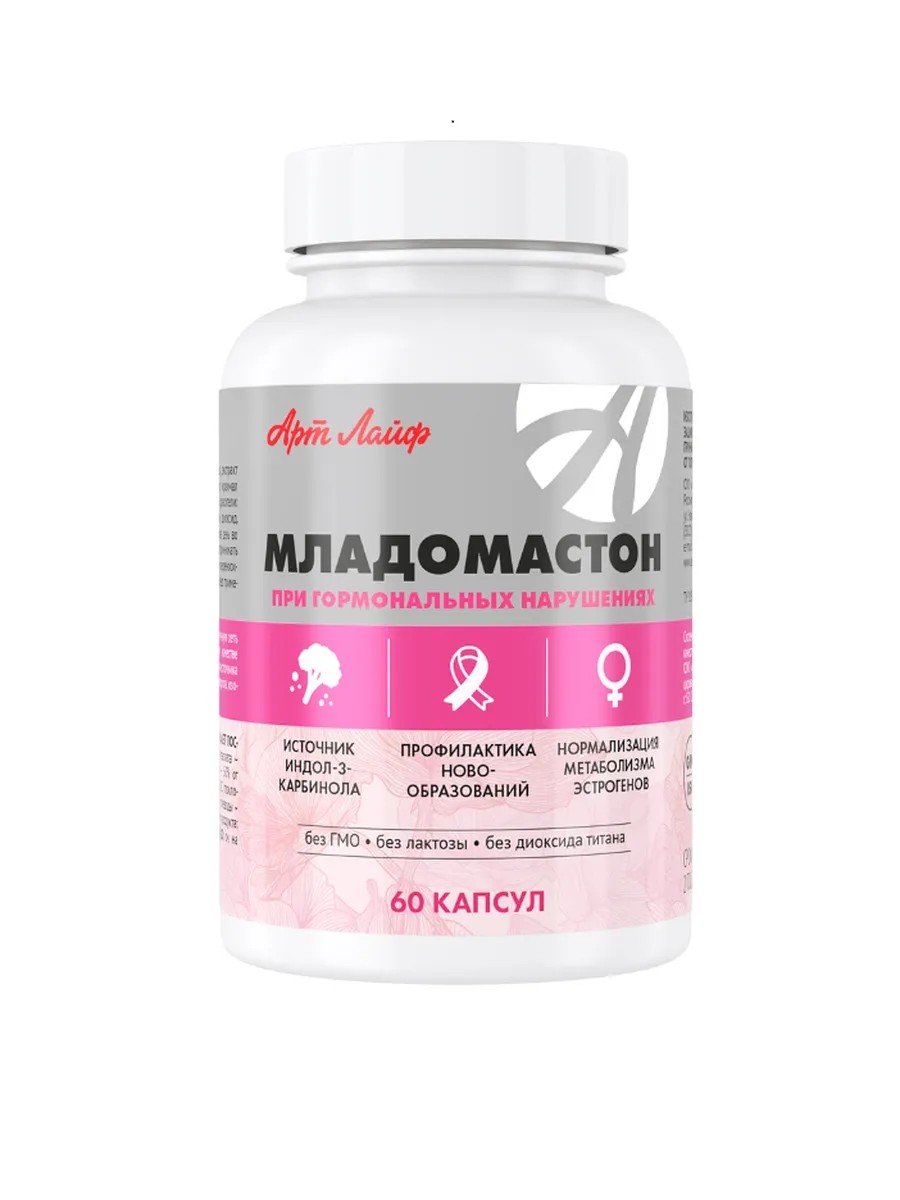 Dietary supplements for health. Mladomaston is a complex of active ingredients that normalizes estrogen metabolism and reduces the risk of cancer in hormone-sensitive tissues in women. Active ingredients: Indole-3-carbinol – a cancer-protecting agent recognized by the World Health Organization – strengthens the immune system, regulates endocrine gland function, influences tumor stages by suppressing mutations in healthy cells, and inhibits the proliferation of diseased cells. Epigallocatechin gallate – used in combination therapy reduces the number and size of tumors and inhibits cancer cell growth. Resveratrol – can restore the immune and endocrine systems, improve cardiovascular function, slow cell aging, prevent atherosclerosis, inhibit inflammation and allergies, and lower blood glucose levels, halting the development of diabetes. Vitex extract restores reproductive system function, restores normal menstrual cycles and egg production, and alleviates menopause symptoms. Regular use helps manage the following conditions: menopause, complications from hormone therapy, hormonal imbalances, papillomas, endometrial inflammation, mastopathy, fibroids, and the prevention of female reproductive system cancers, including cervical dysplasia. Clinical studies have confirmed the effectiveness of this dietary supplement. To further enhance your health and replenish essential vitamins and minerals, we recommend the popular dietary supplements MultiMegin (Vitamin B, Vitamin E, Vitamin C, Omega 3, Vitamin D3, Lutein), Collagen 7000 (Collagen, Hyaluronic Acid, Biotin), and Calcimax (Magnesium, Zinc, Vitamin C, Calcium). ArtLife is a well-known company with its own scientific base, producing high-quality and safe vitamins and dietary supplements that have been fully certified and tested in Russia.