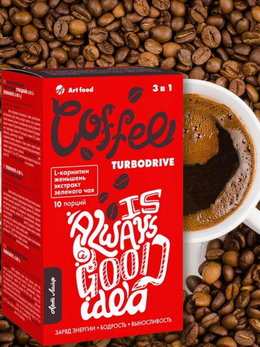 TurboDrive coffee has a traditional taste and invigorating aroma, has a tonic effect, stimulates the central nervous system, increases performance, promotes rapid recovery after exercise, helps cope with increased physical and mental stress.