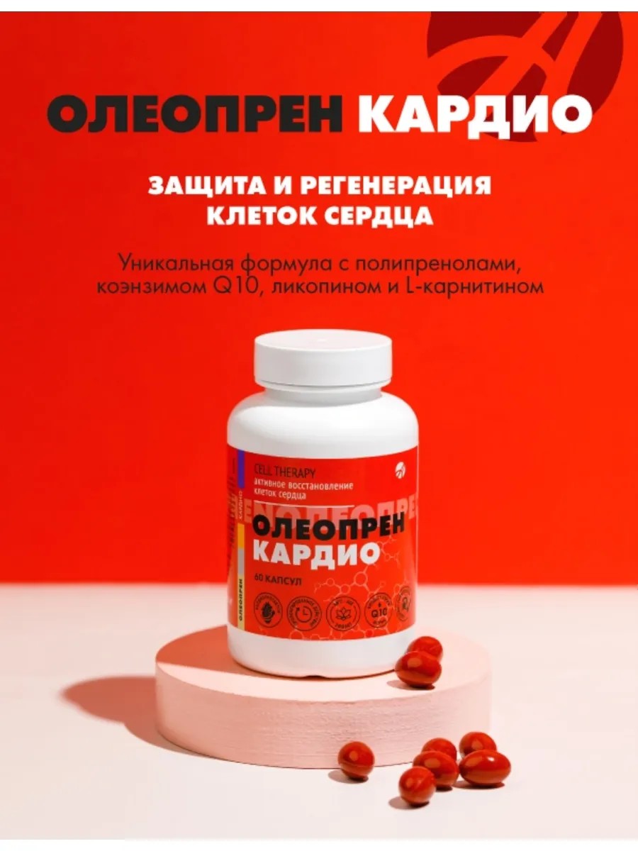 ОлеопренКардио — натуральный кардиопротектор с полипренолами пихты, коэнзимомQ10, ликопином иL‑карнитином. Формула работает на клеточном уровне: восстанавливает мембраны кардиомиоцитов, снижает избыточный холестерин изащищает сердце от оксидативного стресса.