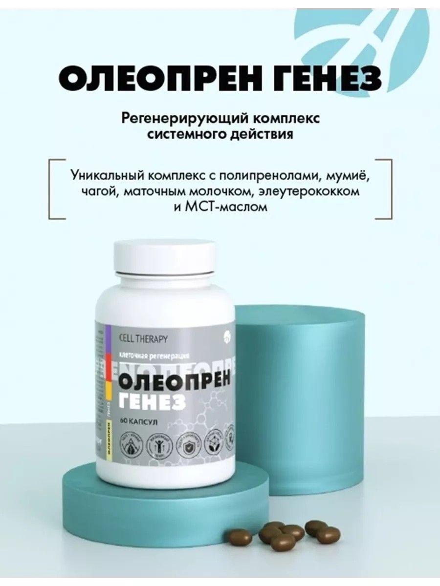 Олеопрен Генез Арт Лайф — это инновационный регенерирующий комплекс, который помогает восстановиться после болезней и стресса. Этот продукт сочетает в себе природные биорегуляторы, такие как полипренолы, мумие и чага березовая натуральная. Комплекс обладает иммуномодулирующим и противовоспалительным действием, что делает его незаменимым помощником для вашего здоровья. Основное действие БАД Олеопрен Генез АртЛайф направлено на активацию процессов регенерации на клеточном уровне. Это способствует сокращению срока болезни и периода восстановления организма после перенесенных заболеваний или стрессовых ситуаций. Продукт также повышает уровень энергии и улучшает обменные процессы в организме, снижая окислительный стресс и токсическую нагрузку. Комплекс эффективен при использовании в оздоровительно-восстановительных программах различной направленности: для иммунной системы, бронхо-легочной системы, опорно-двигательной системы (включая суставы), нервной системы и репродуктивной системы. Эффективность комплекса доказана клинически. Олеопрен Генез рекомендуется для профилактики различных заболеваний: нейродегенеративных нарушений (включая болезнь Альцгеймера), хронических заболеваний внутренних органов (таких как бронхиальная астма или язвенный колит), цирроза печени, заболеваний ЖКТ и нервно-мышечной системы. Он также полезен при иммунодефицитных состояниях и коронавирусах различной этиологии. Преимущества комплекса включают мультифакторное действие с фармацевтической степенью чистоты — 95% концентрат полипренолов. Научно обоснованная эффективность компонентов подтверждена клиническими исследованиями. Комплекс безопасен благодаря растительному происхождению ингредиентов; он обладает высокой биодоступностью с оптимальными дозировками компонентов. Форма выпуска — мягкая желатиновая капсула — обеспечивает удобство применения без побочных эффектов даже при увеличении дозировки до 300 мг активного вещества на капсулу. Это позволяет использовать Олеопрен Генез длительное время без риска для здоровья даже у лиц группы высокого риска. Показания к применению включают восстановление после инфекционных заболеваний (в том числе коронавирусного типа), реабилитацию после операций или травм, лечение острых и хронических заболеваний различных систем организма; коррекцию нарушений обмена веществ; поддержку при повышенных физических или эмоциональных нагрузках; борьбу со стрессом; синдром "хронической усталости"; а также использование в качестве Anti-age комплекса.