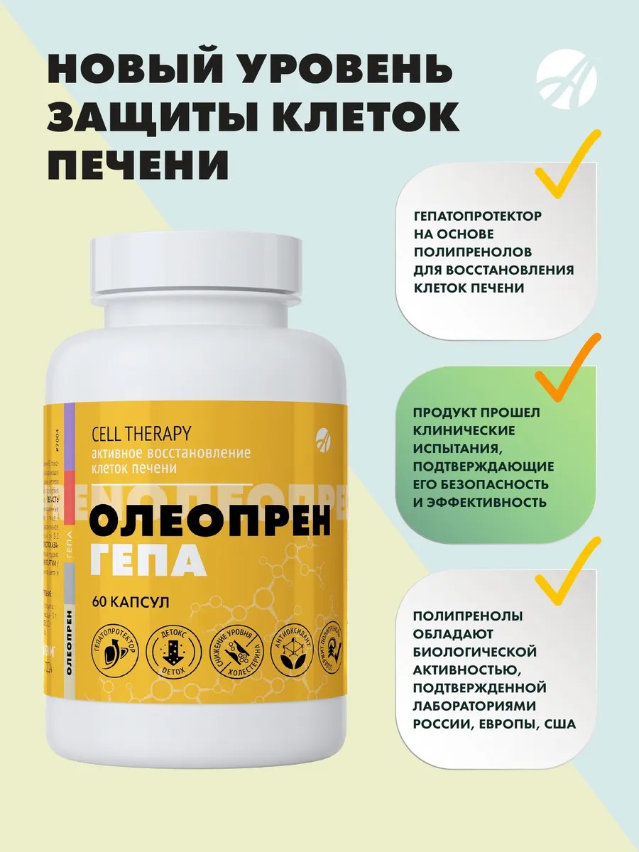 «Олеопрен Гепа» – это передовой комплекс из 60 капсул массой 790 мг. для нормализации работы печени на основе полипренолов пихты сибирской, фосфолипидов и силимарина. Он позволяет защитить и восстановить мембраны клеток печени на разных стадиях повреждения, обладает желчегонным, мембраностабилизирующим, детоксикационным действиями.