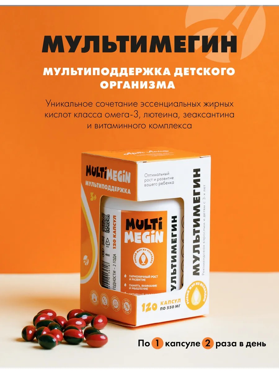 Мультикомплекс для детей и подростков в капсулах, созданный с учетом всех потребностей растущего организма. Биологически активная добавка сочетает Омега-3 жирные кислоты (DHA и EPA), лютеин, зеаксантин и витамины группы B, C, D3 и E, обеспечивая полноценную поддержку здоровья. Продукт помогает укрепить иммунитет, поддерживает зрение, способствует правильному развитию мозга и нервной системы.
