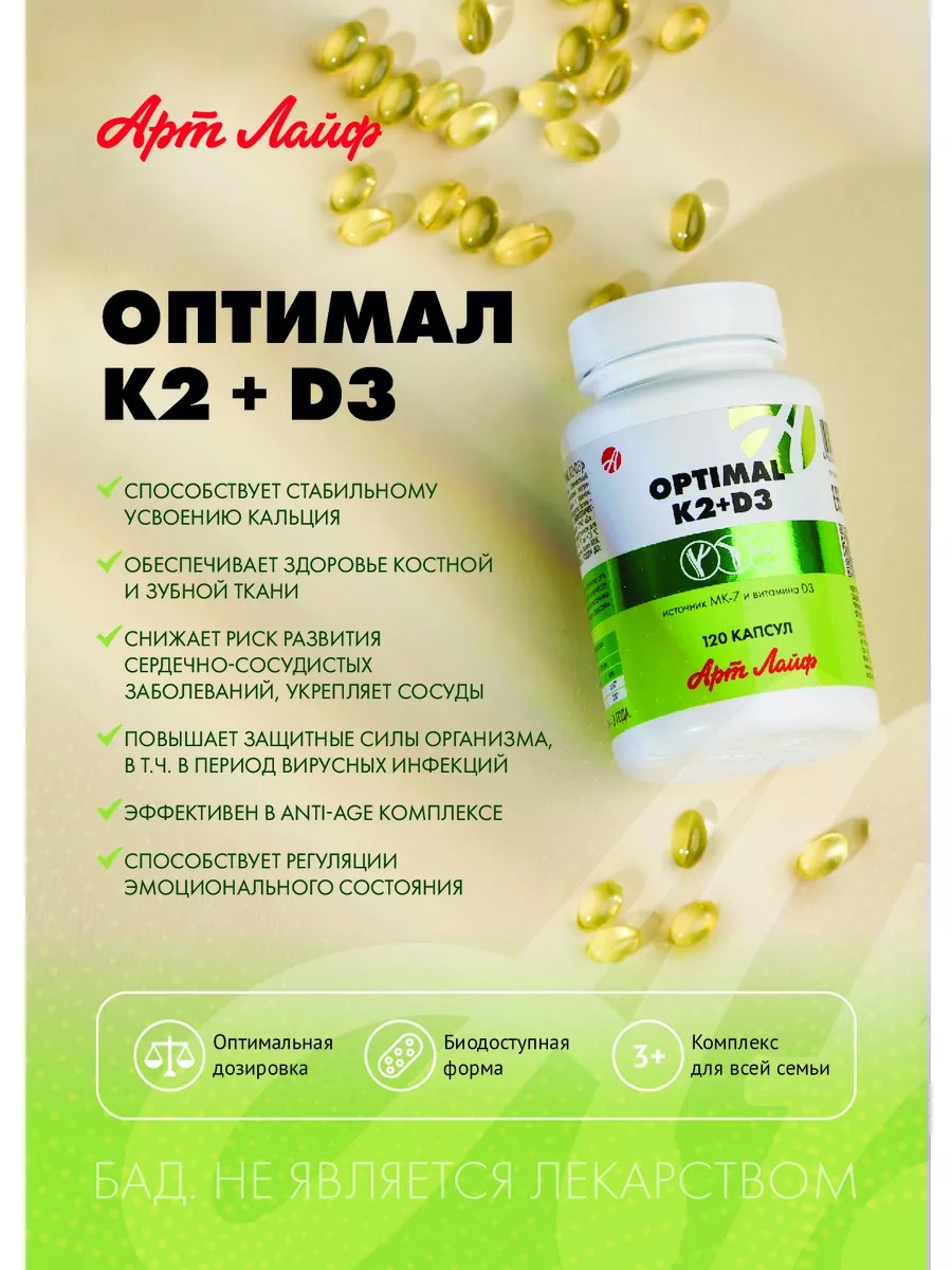 Оптимал К2+Д3 от АртЛайф - Сильный иммунитет, укрепление костной ткани, здоровье нервной системы. Комплекс для детей и взрослых.
