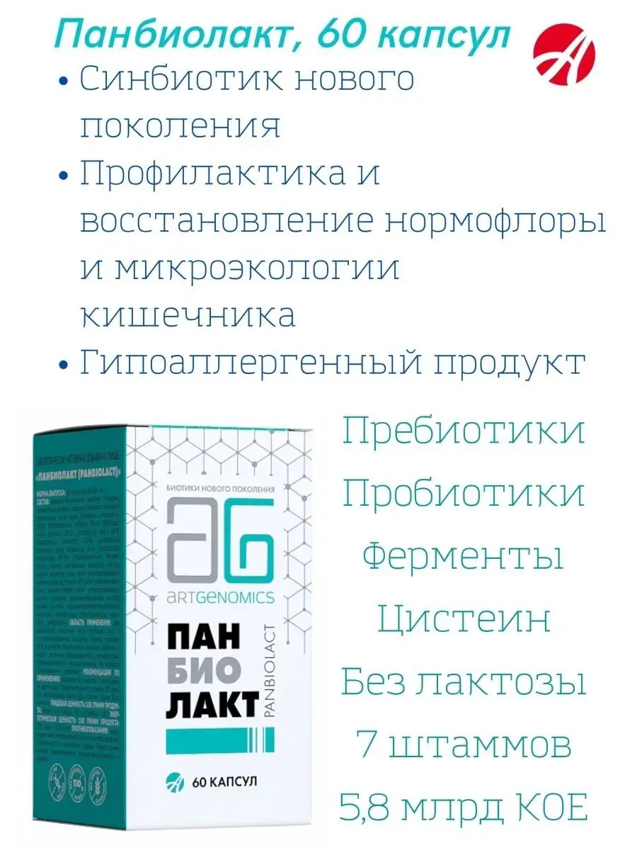 Панбиолакт - синбиотик нового поколения, при разработке которого использованы современные представления и достижения науки в области биотехнологий. Пробиотик для кишечника создан на основе консорциума пробиотических штаммов, пребиотических веществ, ферментов и цистеина. Обеспечивает эффективную регуляцию и поддержание кишечного гомеостаза и микробиоценоза кишечника. Подходит для потребителей с непереносимостью молочного белка. способствует восстановлению нормофлоры и микроэкологии кишечника; позволяет дополнительно регулировать процессы, сопутствующие дисбактериозу (накопление токсинов, воспаления слизистой оболочки кишечника); безопасен для потребителей с непереносимостью молочных продуктов; позволяет значительно снизить продолжительность терапии дисбиоза ввиду высокой концентрации колониеобразующих единиц в суточной дозе, способности бактериальных штаммов к колонизации кишечника и подавлению патогенных микробов. БАД Панбиолакт может быть использован: для восстановления нормального микробиоценоза кишечника после воздействия неблагоприятных факторов, в т.ч. после тяжелых заболеваний, антибактериальной, гормональной, химио- или лучевой терапии; в качестве дополнительного средства при нарушениях работы пищеварительной системы (диарея, диспептические расстройства, метеоризм, отравления и др.), кишечных инфекциях, кандидозах; при аллергических заболеваниях и атопическом дерматите; для профилактики кишечных расстройств при смене рациона, климата, в поездках. Пробиотические бактерии: Комплекс содержит 7 штаммов живых бифидо - и лактобактерий, пропионовокислых микроорганизмов в концентрации 5,6 миллиарда (5,6x109) КОЕ/ 2 капсулы. Бактериальные штаммы: физиологичны для кишечника взрослого человека; обладают высокой способностью к активному воспроизводству и колонизации эпителия;проявляют высокую антагонистическую активность по отношению к патогенным микроорганизмам;выращены на безмолочных средах: не содержат лактозу и белки молока, безопасны для людей с пищевой чувствительностью к молочным продуктам;защищены технологией микрокапсулирования от агрессивных факторов пищеварительной среды;