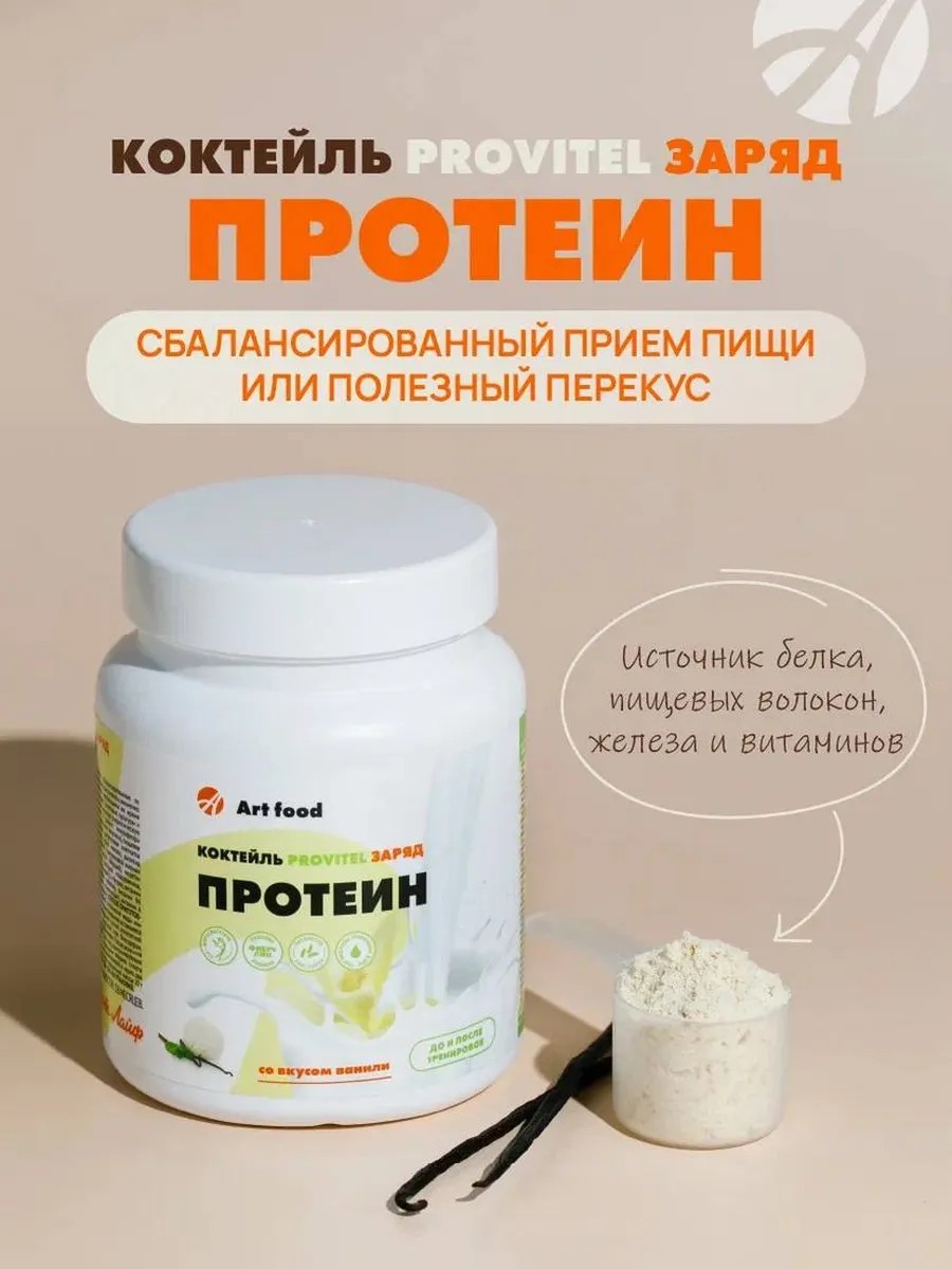 The Art Life "Provitel Zaryad" protein shake is a high-protein product containing easily digestible soy protein with a balanced amino acid composition.