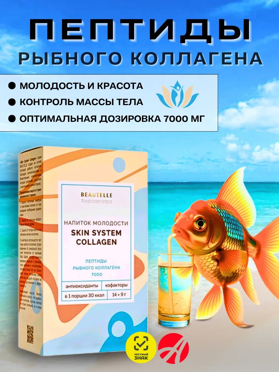 Продукт на основе пептидов рыбного коллагена и комплекса полезных нутриентов, богатый антиоксидантами и биоактивными компонентами, которые увлажняют, укрепляют кожный барьер, защищая её от внешних агрессивных факторов. Активные компоненты способствуют защите от преждевременного старения, сохранению молодости и красоты.