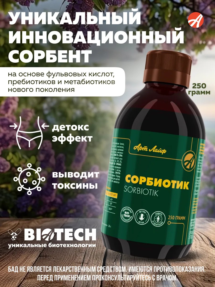 Сорбиотик от Артлайф - борьба с токсинами и восстановление микроэкологии кишечника. Уникальный инновационный сорбент на основе фульвовых кислот, пребиотиков и метабиотиков нового поколения. Обладает выраженным детоксикационным эффектом, улучшает функциональную активность желудочно-кишечного тракта, помогает поддерживать баланс и видовое разнообразие полезных пробиотических бактерий. Преимущества: активизирует процессы выведения эндо- и экзотоксинов из организма; подавляет рост патогенных бактерий, вирусов и грибков; обеспечивает условия для роста кишечной бифидофлоры; регулирует функциональность кишечника; содержит продукты биотехнологий нового поколения: бактерии, использованные для производства метафильтратов, выращены на гипоаллергенных средах и безопасны для потребителей с непереносимостью лактозы и молочного белка. Показания: при любых заболеваниях ЖКТ любой этиологии; для нормализации микрофлоры организма; при инфекционных заболеваниях; для очищения организма от шлаков; в комплексной терапии практически любых патологий; в программах по похудению; для укрепления иммунитета; при лишнем весе и ожирении; при нарушении обменных процессов в организме; при интоксикации организма; при проживании в условиях плохой экологии. с целью профилактики, в качестве комплексного лечения дисбиоза, дисбактериоза; для регуляции сократительной функции; для стимуляции иммунитета, локальных защитных сил при различных проблемах желудочно-кишечного тракта; для выведения экзотоксинов, поступивших с пищей, через кожные покровы; для нейтрализации токсинов при различных вирусных поражениях, тяжелых воспалениях, сопровождающихся общей интоксикацией; для выделения негативных продуктов обмена - мочевины, холестерина; для терапии, профилактики энтерогенных заболеваний печени, желчного пузыря. Способ применения: Взрослым по 5,5 г концентрата (1ч.л.) 3 раза в день во время еды. Допускается предварительно растворять в небольшом количестве любой жидкости (30-50 мл), кроме молока. Курс приёма 1 месяц. По рекомендации врача курс приёма может быть изменен. Перед употреблением взбалтывать. Состав: флорация, метафильтраты Bifidobacterium bifidum, Bifidobacterium breve, Lactobacillus delbrueckii subsp. bulgaricus, Hericium coralloides, Propionibacterium freudenreichii, лактулоза, постбиотический метафильтрат «Субтизим (Subtizym)», кремния диоксид, «Эндофульвин (Endofulvin гуминовые кислоты)», хитозан, парааминобензойная кислота, витамин В3 (никотинамид), цистеин, витамин В5 (кальция пантотенат), витамин В2 (рибофлавин), молочная кислота (регулятор кислотности). Активные компоненты: комплекс Эндофульвин в составе Сорбиотика артлайф отвечает за выделение токсических веществ, нормализацию потенциала клеточных структур - процессы возобновляются на клеточном уровне, ткани насыщаются кислородом, запускается процесс регенерации тканей; диоксид кремния, хитозан, выводящие радионуклиды, ионы металлов, избыточные продукты метаболизма, частички мертвых клеток, пищевые аллергены. Кремний служит в качестве сорбента - молекулы притягивают, выводят частицы. Хитозан предотвращает попадание негативных частичек в кровяное русло, их распространение, оседание в органах выделительной системы; постбиотический метафильтрат проявляет активность против ряда вирусов, грибков - останавливает деление и распространение, уменьшает их