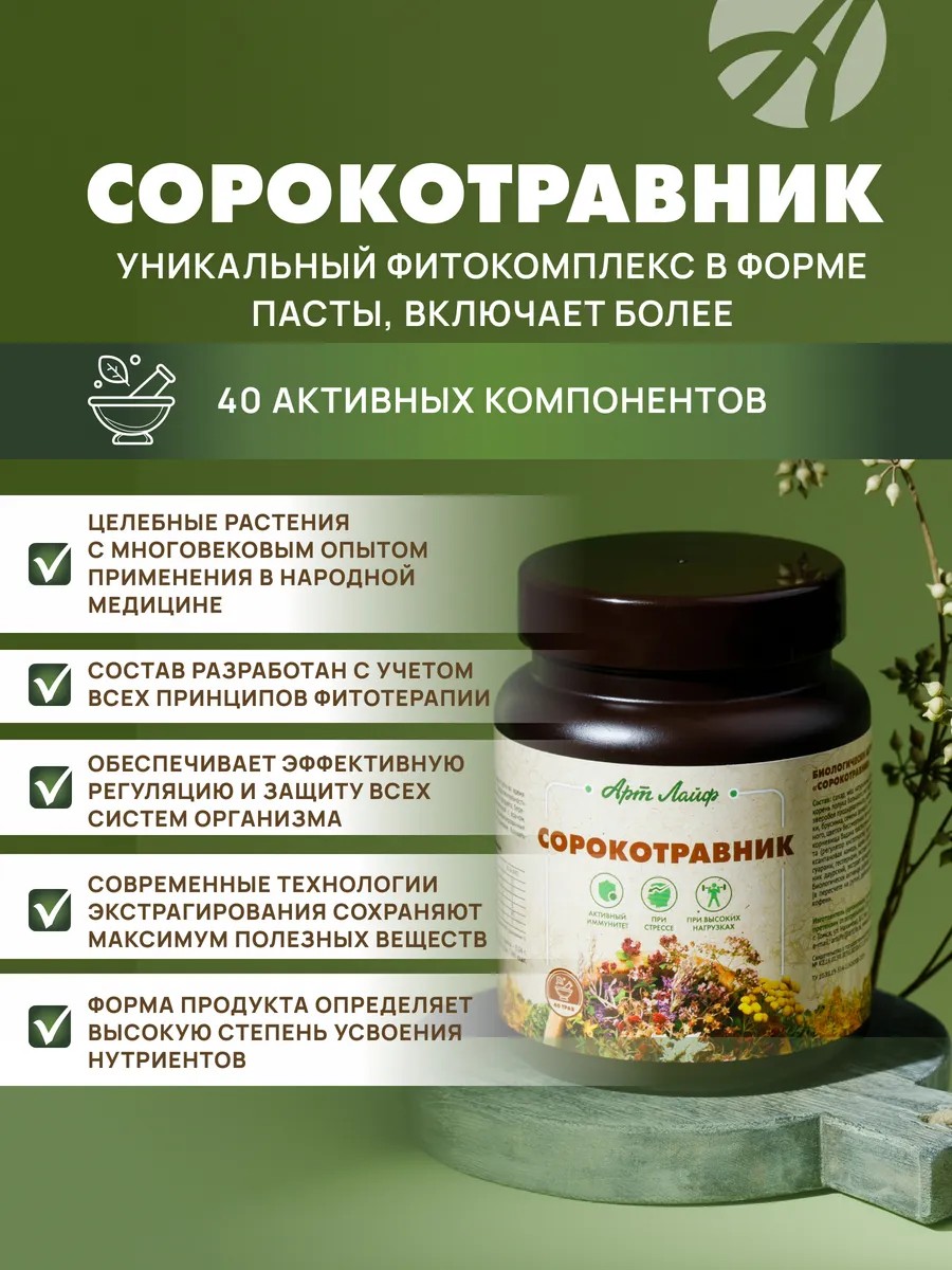 «Сорокотравник» оказывает мощную поддержку организма и профилактику различных заболеваний для людей всех типов конституции.