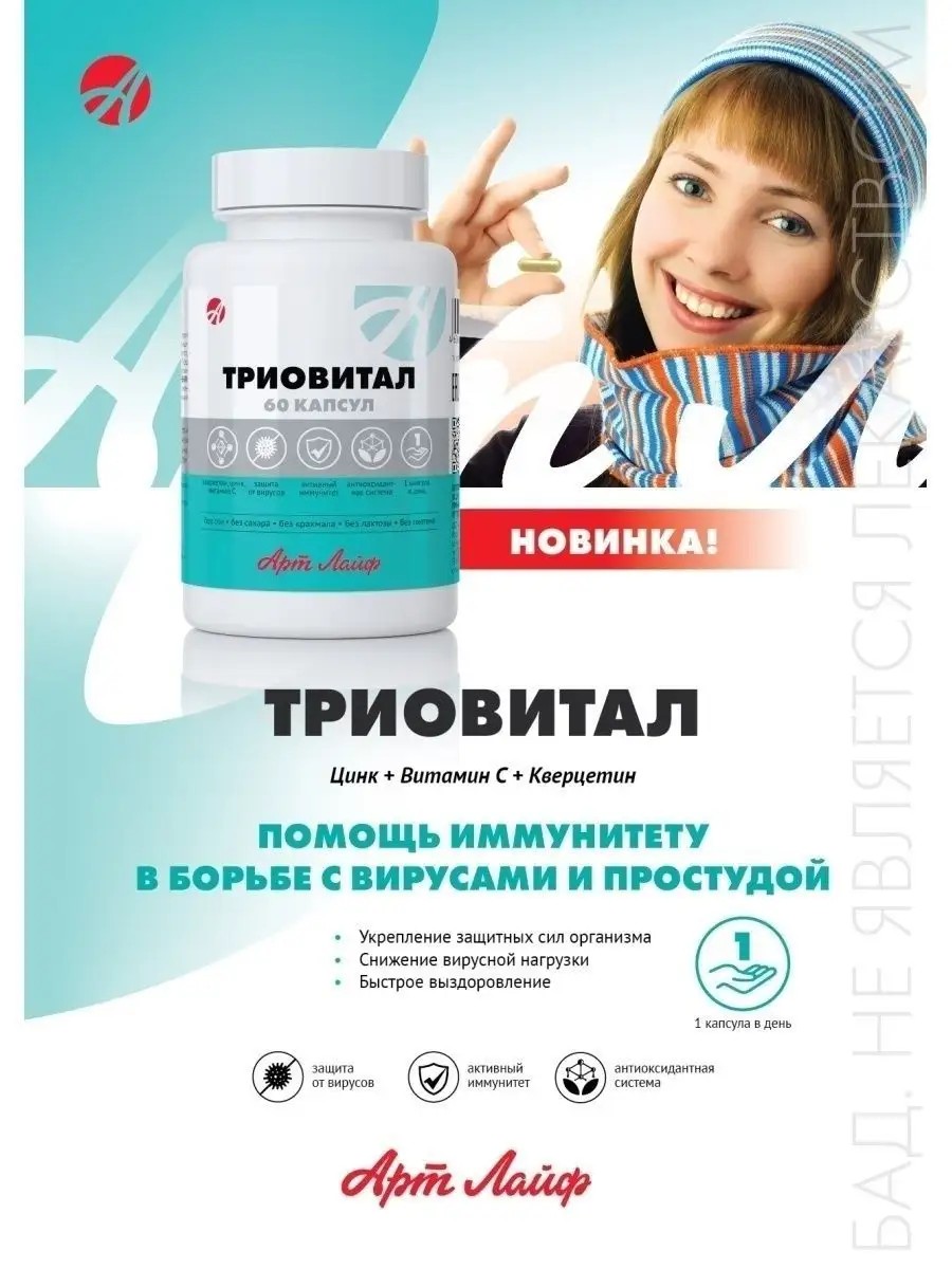 Триовитал от компании Артлайф- это комплекс для профилактики, снижения вирусной нагрузки и укрепления иммунитета в период эпидемий коронавирусной инфекции, гриппа, ОРВИ, а также сезонных заболеваний. Препарат создан с учетом рекомендаций международных протоколов профилактики и лечения коронавирусной инфекции COVID–19. Сочетает в себе несколько активных компонентов - кверцетин, цинк и витамин С, которые, усиливая действия друг друга, обеспечивают высокую эффективность препарата. Бад рекомендуется как на ранних стадиях заболевания – активно действует в инкубационный период, так и при затяжном течении болезни. Комплекс от Art life ативирует защитные функции организма, препятствуя дальнейшему размножению вирусов. Усиливает барьерную функцию верхних и нижних дыхательных путей. Способствует сокращению продолжительности болезни и снижению вероятности осложнений в виде воспалений и вторичных бактериальных инфекций. Укрепляет стенки кровеносных сосудов и капилляров. Повышает антиоксидантную защиту. Применяется для профилактики и в составе комплексной терапии коронавирусных инфекций, гриппа и ОРВИ. В составе комплексной терапии инфекционных и хронических заболеваний дыхательных путей. Лицам, находящимся в группе риска по наличию хронических заболеваний и по возрасту – старше 60 лет. Общее ослабление иммунитета и склонность к частым вирусным заболеваниям. Вирус простого герпеса. В качестве дополнительного источника витамина С и цинка.
