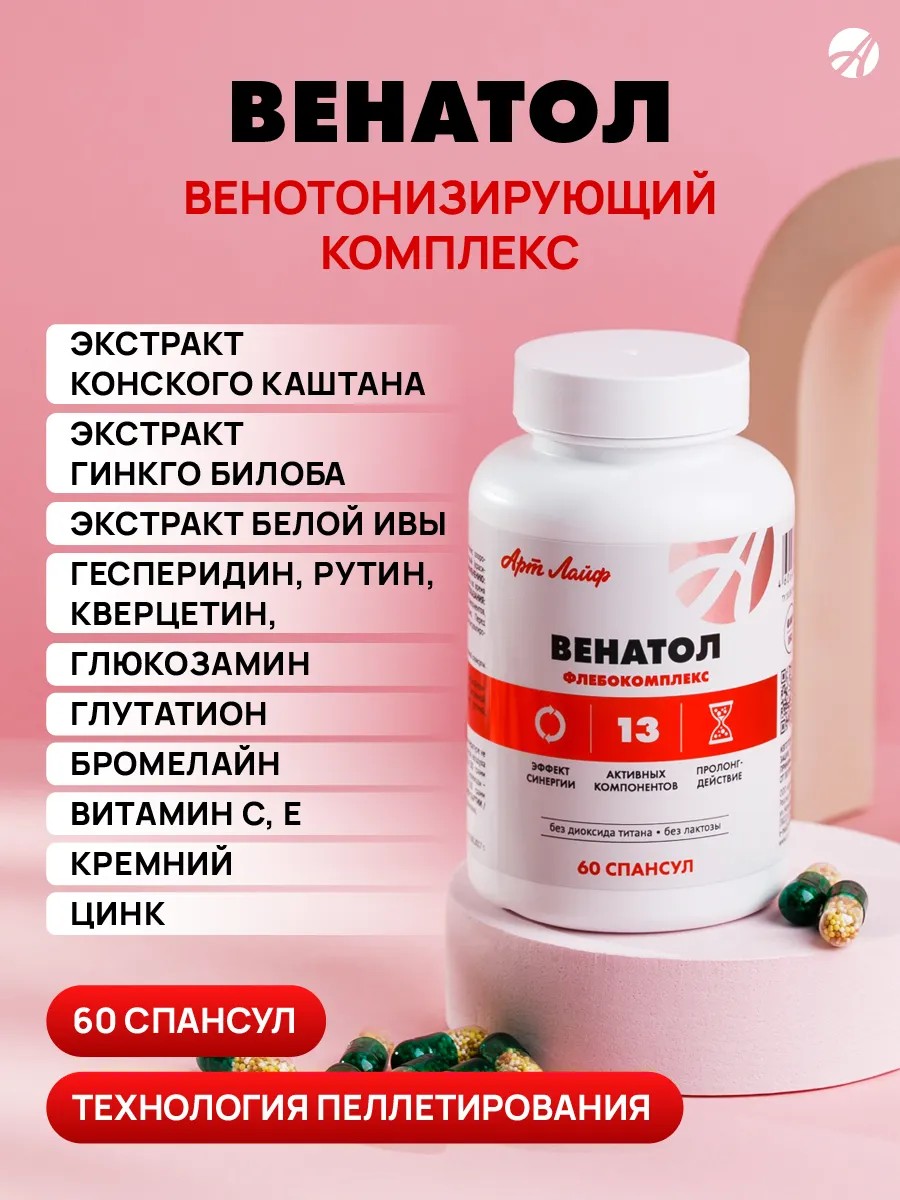 Venatol is a powerful complex based on horse chestnut extract, ginkgo biloba, rutin, vitamins C and E, and bromelain, designed to strengthen blood vessels, improve venous outflow, and prevent varicose veins.