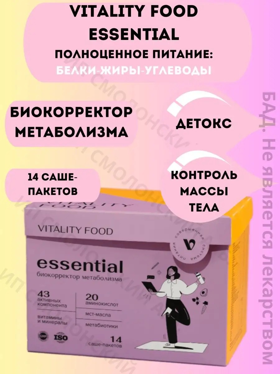 Виталити Фуд Эссеншл - совершенная система питания, обеспечивающая организм полным набором необходимых веществ, замена приема пищи. Идеальная формула сбалансированного питания, разработанная по последнему слову науки. Продукт включает более 40 активных элементов: макронутриенты, витамины, минералы, пребиотики, метабиотики и антиоксиданты. Благодаря многокомпонентному составу всего 1 порция БАД в день обеспечивает организм полным набором незаменимых веществ, высоким уровнем энергии и отличным настроением. Продукт помогает легко скомпенсировать погрешности и дефициты ежедневного рациона, корректирует обменные процессы, способствует оптимальной работе всех систем организма, сохраняя красоту и молодость.