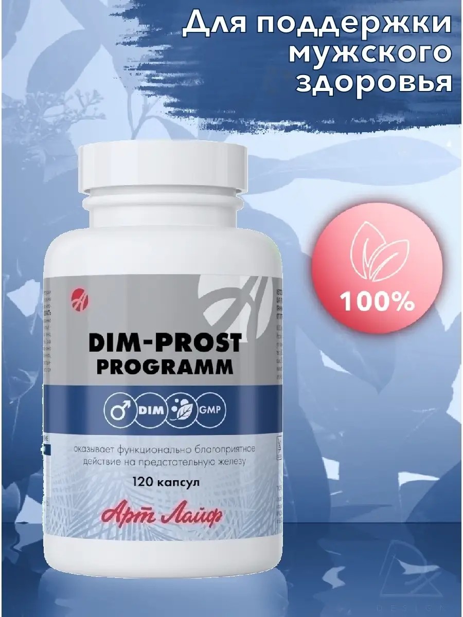 ДИМ-прост программ компании Арлайф для поддержки мужского здоровья, гормонального баланса и половой системы. Дииндолилметан (DIM) отвечает за нормальную работу половой системы, стимулирует функции предстательной железы, улучшает качество спермы, уменьшает проявления простатита - ночные боли, дискомфорт при мочеиспускании, улучшает сон. Повышает сексуальное влечение, улучшает потенцию и оргазмические ощущения. Эффективен при эректильной дисфункции. Экстракты пальмы Сабаль и пиджеума содержат спектр природных соединений (в том числе флавоноиды, стерины, жирные кислоты), которые известны своей способностью поддерживать здоровье предстательной железы, обладают противовоспалительным и противоотечным действием, уменьшает неприятные ощущения при простатите. Корень куркумы - улучшает фертильность, снижает риск рака простаты при наследственной склонности. Петрушка улучшает состояние мускулатуры кишечника, мочевого пузыря за счет стимуляции выделительных функций. Взрослым мужчинам по 1 капсуле 2 раза в день во время еды. Курс приёма 30 дней. Курс приема можно повторить. Art Life.