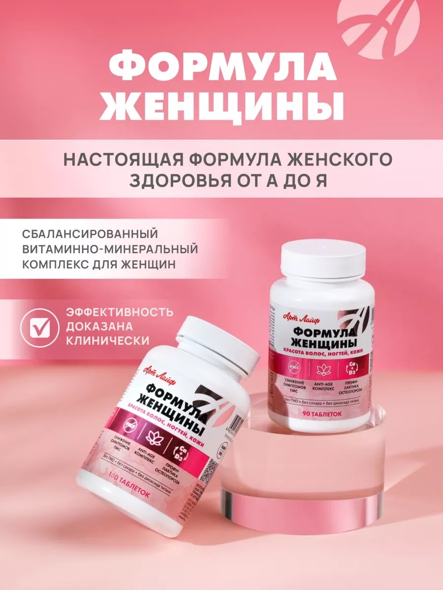 Art Life's Women's Formula vitamin and mineral complex. A balanced complex designed to meet the needs of the female body. It improves the synthesis and maintains the balance of female sex hormones and estrogens. It helps eliminate problems associated with premenstrual syndrome, pre- and postmenopause. It is also used to prevent inflammation of the female reproductive system. It is also used for dry skin, brittle hair and nails. It normalizes the mineral balance in the body and is recommended for the prevention of diseases associated with hormonal changes: osteoporosis, breast and genital tumors. Plant extracts, minerals, vitamins, and amino acids have a beneficial effect on normal metabolism in the female body. Phytoestrogens dilate blood vessels, which reduces pain, spasms, and cramps associated with premenstrual syndrome. Benefits of the complex: regulates the menstrual cycle thanks to phytoestrogens; increases stress resistance; improves the condition of nails, skin, and hair; fast, comprehensive action; targeted delivery of active ingredients. Directions for use: Adults take 1 tablet twice daily with meals. Duration of treatment is 1 month. Indications: Prevention of inflammatory processes in the pelvic organs; Prevention of mastopathy, polycystic ovary syndrome, uterine fibroids, endometritis; Prevention of secondary anemia, allergic reactions, decreased immunity; Treatment of chronic fatigue syndrome; To relieve the negative effects of chemotherapy and radiation therapy; To eliminate toxins from the body; Hormonal imbalance; Premenstrual syndrome; Menopause; Skin problems (dryness, decreased elasticity, rash, peeling); Hair loss; Brittleness, darkening of the nail plate; During preparation for pregnancy; Prevention of premature aging. INGREDIENTS: Calcium carbonate, hops (cones), sodium ascorbate (vitamin C), magnesium oxide, alfalfa, agrimony, inositol, Chinese angelica, choline bitartrate, potassium chloride, iron sulfate, curly thistle, schisandra (fruit), curly thistle, damiana, silicon oxide, lecithin, bromelain, bioflavonoids, niacinamide (B3), L-methionine, L-cysteine, freeze-dried garlic, ginseng root, cayenne pepper, zinc oxide, manganese asperaginate, tocopherol acetate (E), ginkgo biloba (extract), calcium D-pantothenate (B5), para-aminobenzoic acid, octacosanol, royal jelly, potassium iodate, sodium selenite, chromium picolinate, Pyridoxine hydrochloride (B6), Thiamine mononitrate (B1), riboflavin (B2), retinol acetate, folic acid (B9), biotin, cholecalciferol (D3), cyanocobalamin (B12). DOSAGE: Taking 2 tablets provides the following intake: Vitamin A - 0.74 mg - 93%, vitamin E - 5.5 mg - 55%, vitamin D3 - 0.0054 mg - 108%, vitamin C - 50 mg - 83%, vitamin B1 - 1 mg - 200%, vitamin B2 - 0.8 mg - 71%, vitamin B3 - 10 mg – 50%, vitamin B5 – 4.2 mg – 56%, vitamin B6 – 1.0 mg – 70%, vitamin B9 – 0.3 mg – 50%, vitamin B12 – 0.0018 mg – 180%, biotin – 0.1 mg – 200%, chromium – 0.025 mg – 48%, manganese – 0.96 mg – 48%, iodine – 0.074 mg – 50%, selenium – 0.034 mg – 50%, zinc – 6 mg – 40%, magnesium – 7.4 mg – 53, iron – 3.7 mg – 26%, calcium – 80 mg – 8% of the recommended daily intake. Art Life