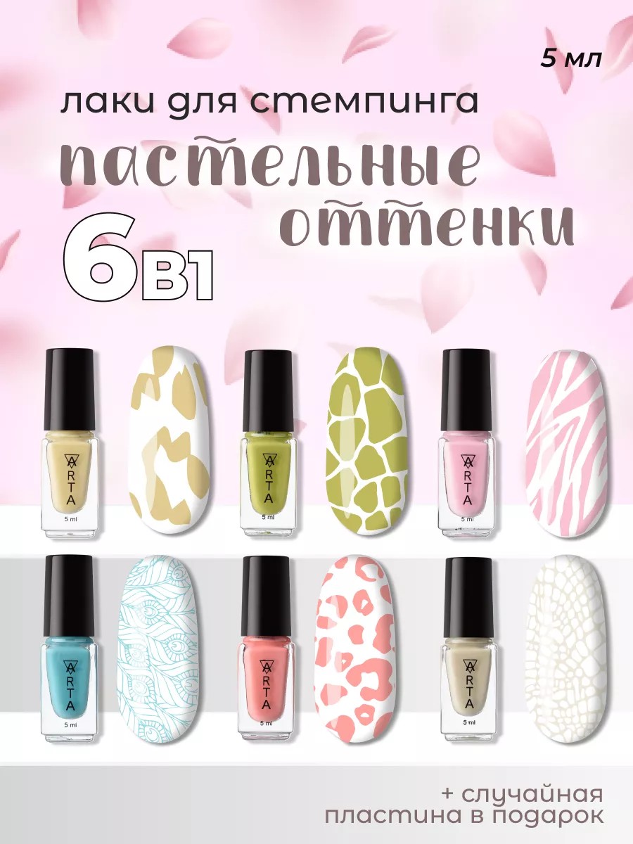 Набор пастельных лаков для стемпинга ART-A 6 штук + случайная пластина в подарок .Богатый ассортимент нежных оттенков позволить выбрать то, что нужно для вашего маникюра.Краска для ногтей имеет плотную,высокую пигментированость,прекрасно сочитается и смешивается между собой,с ней ваш nail-дизайн будет более яркими и насыщенными.Stemping набор отлично переносится на металлическую пластину и поверхность ногтя.Чётко отпечатывают рисунки и без труда распределяются по пластине.Не требует сушки в лампе,сохнет на воздухе 30-40 сек,новичкам будет комфортно работать.Способ применения: Нанесите лак на пластину. Удалите излишки скребком. Перенесите на штамп для стемпинга,плавным перекатывающим движением изображение на ноготь. Закрепите топом для ногтей.Комплект состоит из пастельных популярных весенних,летних,осенних цветов и рандомной пластины.Стартовый набор отлично подойдёт для тех кто ниразу не пробовал делать стемпинг дизайн и сможет с лёгкостью создать красивые узоры и градиент.