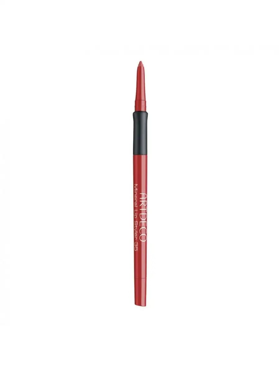 Artdeco, Mineral Lip Styler, Shade 35. Create the perfect lip contour with the fragrance-free Mineral Lip Styler. Candelilla wax creates a soft texture, while mica enhances application. Hyaluronic acid hydrates the soft lips. Free from mineral oils and parabens, this lip pencil is eye-catching and feels so comfortable to wear. The rubber tube ensures a secure hold, and the built-in sharpener ensures the tip is perfectly shaped. The pencil is easy to screw in.