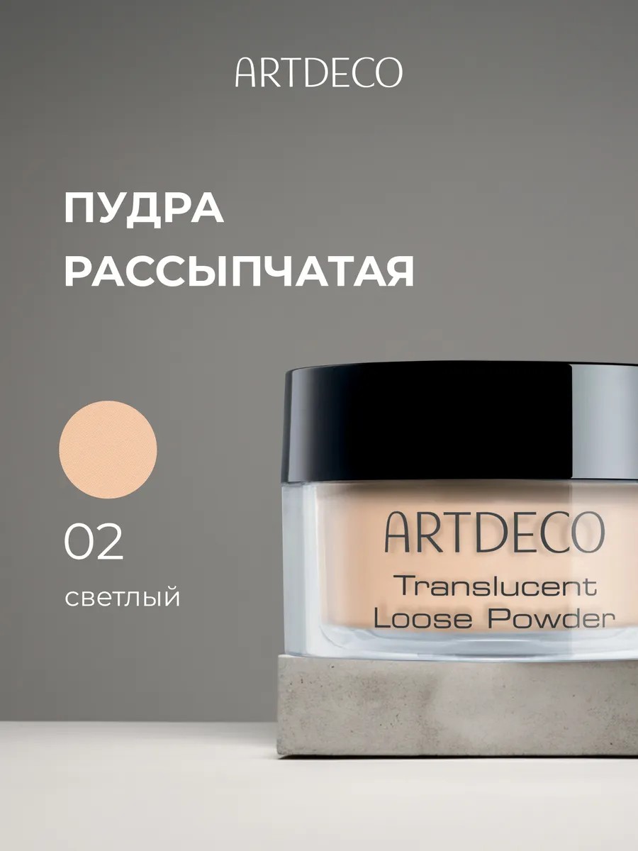 ARTDECO (АРТДЕКО) Пудра для лица рассыпчатая Translucent Loose Powder тон 02 светлый 8г. Полупрозрачная рассыпчатая пудра Translucent Loose Powder фиксирует макияж, совершенно не заметна на коже и сохраняет ровный и свежий цвет лица в течение всего дня. Пудра легко и равномерно наносится, не утяжеляя макияж и не искажая тон кожи. Текстура не содержит талька, она "вплавляется" в кожу и держится в течение длительного времени. Натуральная слюда в составе придаст коже шелковисто-матовый финиш, Рисовый крахмал абсорбирует излишки кожного жира, витамин Е - сохранит молодость кожи. Кроме того, после окончания пудры, ее можно заменить сменным блоком. Это сохранит ваши средства и станет вкладом в снижение загрязнения планеты. VEGAN,CRUELTY FREE, ПЕРЕРАБАТЫВАЕМАЯ УПАКОВКА. СПОСОБ ПРИМЕНЕНИЯ: Наберите рассыпчатую пудру кистью для пудры и слегка стряхните. Равномерно нанесите на всё лицо или отдельные части. Инструкция по замене блока в пудренице: Шаг 1: Откройте пудру Translucent Loose Powder.Шаг 2: Извлеките блок с использованной пудрой из пудреницы, вытолкнув его снизу.Шаг 3: Снимите защитную крышку с нового блока и зафиксируй его в пудренице сверху, следуя направляющим линиям.Шаг 4: Снимите прозрачную плёнку с пудры и закрутите крышку.