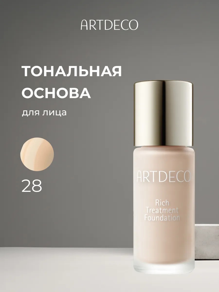 ARTDECO (АРТДЕКО) Тональная основа Rich Treatment тон 28, 20мл. Тональный крем-уход Rich Treatment - идеальное средство для сухой или обезвоженной кожи! Мягкая питательная текстура, насыщенная натуральными ухаживающими компонентами, устойчива на коже. Крем обладает великолепным светоотражением, благодаря использованию уникальных японских технологий. Экстракт Горечавки оказывает выраженное тонизирующее действие, а экстракты корней Шелковицы и Солодки укрепляют капилляры и предотвращают появление пигментных пятен. Забудьте про невыразительный, тусклый цвет лица - Ваша кожа светится здоровьем и красотой! СПОСОБ ПРИМЕНЕНИЯ: Очистите кожу, нанесите крем подходящий вашему типу кожи и дайте ему впитаться. Нанесите небольшое количество тональной основы кончиками пальцев, затем растушуйте ее разглаживающими мазками от центра лица к внешним контурам. Для более плотного покрытия используйте кисть для тональных основ.