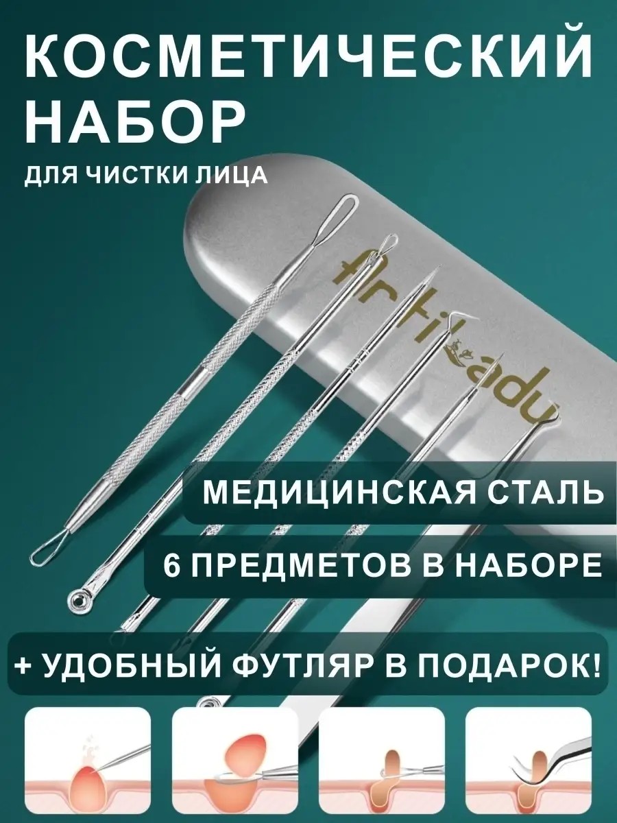 КомплектацияМеталлический футляр; инструменты для чистки лица и пор 4шт; инструменты для чистки лица и пор 6шт