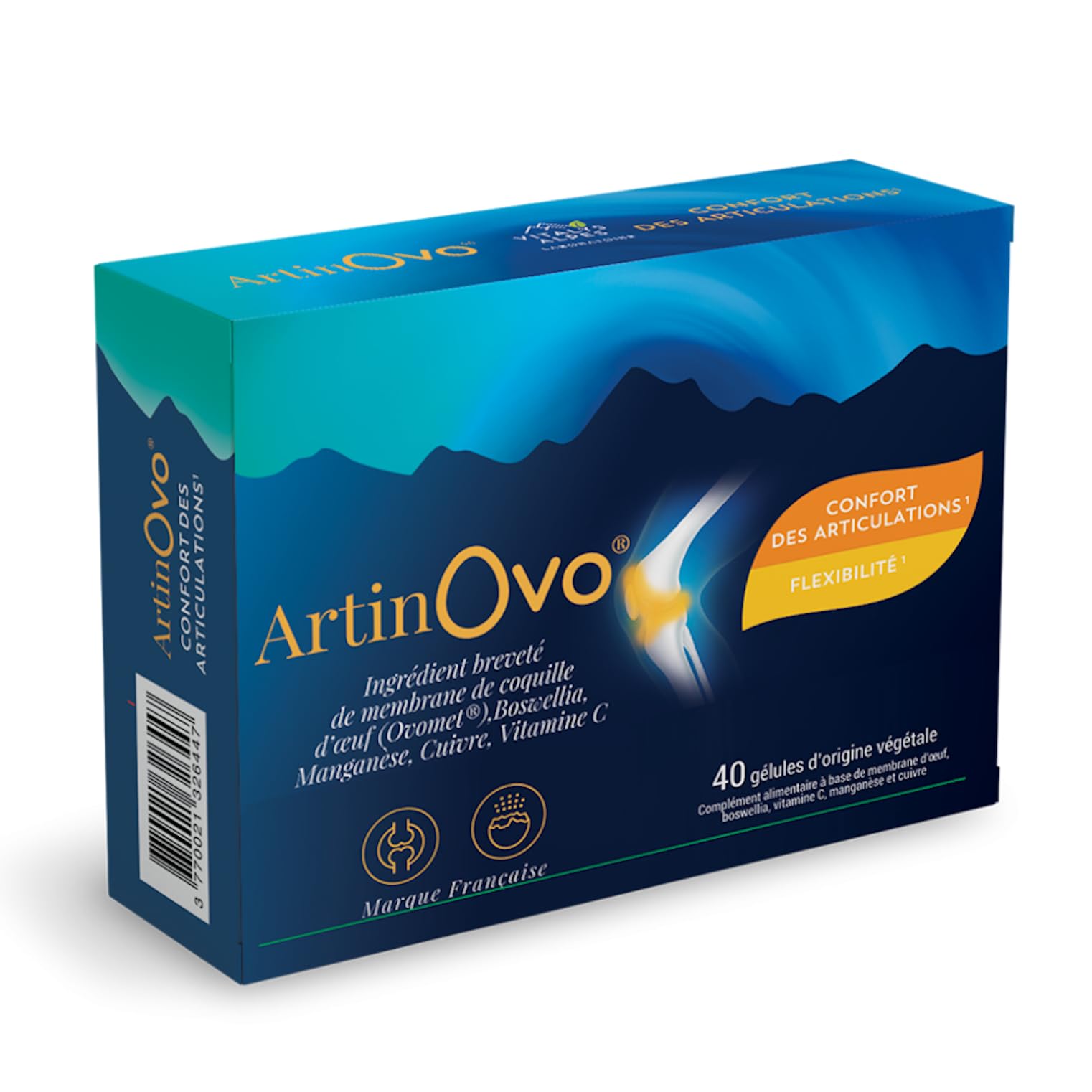 40 gélules, 2 gélules 1 fois par jour. Cure de 20 jours. Actif breveté Ovomet Efficacité scientifiquement prouvée. Confort des articulations grâce au boswellia. Contribue à la flexibilité grâce au boswellia. Ovomet, dont collagène, élastine et acide hyaluronique, Extrait de Boswellia dont acide boswellique, Vitamine C, Manganèse et Cuivre.