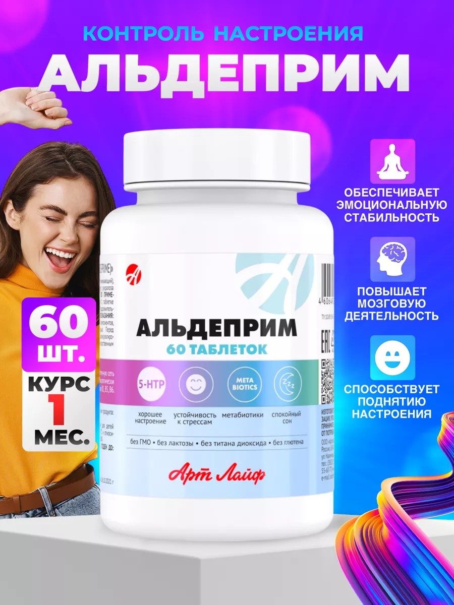 Aldeprim is a complex innovative product that regulates metabolic processes in the brain: it promotes the synthesis of serotonin and melatonin in the body, reduces the effects of stress, activates thinking, improves mood, and promotes easy sleep.