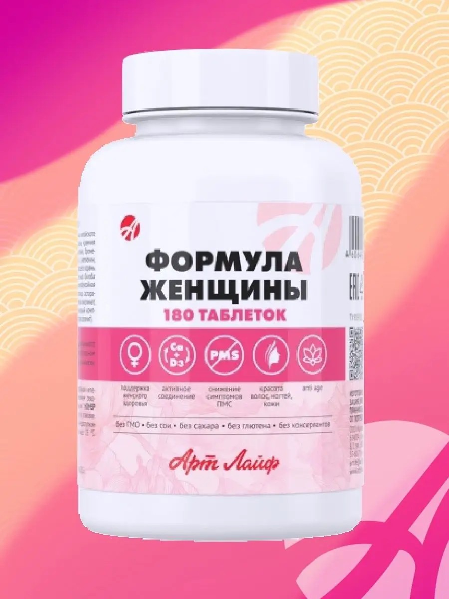 «Формула женщины» – идеально сбалансированный комплекс, созданный с учетом потребностей женского организма.В состав биологически активного комплекса «Формула женщины» входит сбалансированное сочетание экстрактов хмеля, люцерны, дамианы, дудника китайского, женьшеня, содержащих особые вещества – фитоэстрогены. Фитоэстрогены, попадая в организм женщины с пищей, нормализуют ее гормональный статус, поддерживают физиологический (естественный) гормональный баланс, регулируют менструальный цикл. Благодаря своим свойствам расширять сосуды, фитоэстрогены также способны существенно снизить боль, спазмы и судороги, связанные с предменструальным синдромом. Биоактивный комплекс «Формула женщины» устраняет неприятности, связанные с пре- и постклимаксом, поддерживает тонус женских половых органов, особенно в период климакса. Комплекс «Формула женщины» благодаря широкому спектру содержащихся в нем минеральных солей, предохраняет женский организм от развития остеопороза, одной из причин развития которого является колебание уровня эстрогенов в женском организме, и особенно их снижение у женщин зрелого возраста.Показания:улучшение синтеза женских половых гормонов;сохранение баланса женских половых гормонов;предменструальный синдром;климактерический синдром;сухость кожи, ломкость волос и ногтей;профилактика воспалений женской половой сферы.Рекомендации по применению: рекомендована в качестве дополнительного источника витаминов (А, D, Е, С и группы В) и минеральных веществ (цинка, железа, йода, селена).Способ применения: взрослым по 1 таблетке 2 раза в день во время еды.Прием двух таблеток (рекомендуемая доза) обеспечивает поступление витаминов А – 0,74 мг (74%); Е – 5,5 мг (55 %); D3 – 0,0054 мг (108%); С – 80 мг (110%); В1 – 1 мг (67%); В2 – 0,8 мг (44%); В3 – 10 мг (50%); В5 – 4,2 мг (84%); В6 – 1 мг (66%); В9 – 0,3 мг (150%); В12 – 0,0018 мг (60%); биотин – 0,1 мг (200%); минералов: хрома – 0,025 мг (50%); марганца – 0,98 мг (50%); йода – 0,074 мг (50%); селена – 0,034 мг (50%); цинка – 6 мг (40%); железа – 3,7 мг (26%); кальция – 80 мг (8%); магния – 30 мг (8%) от суточной потребности.Противопоказания: индивидуальная непереносимость компонентов продукта. Перед применением рекомендуется проконсультироваться с врачом.Состав: пиколинат хрома, марганца сульфат, цинка оксид, калия йодат, железа сульфат, калия хлорид, магния оксид, кальция карбонат, натрия селенит, кремния диоксид, октакозанол, гамма-линолевая кислота, парааминобензойная кислота, L-цистеин, L-метионин, бромелайн, лецитин, цитрусовые биофлавоноиды, холина битартрат, инозитол, маточное молочко, чеснок сублимированный, экстракт гинкго билоба, корень женьшеня настоящего, плоды кайенского перца, плоды лимонника китайского. трава волчеца кудрявого, дамиана, корни дудника китайского, трава люцерны посевной. трава репешка обыкновенного. шишки хмеля обыкновенного, натрия аскорбат, витамины А, Е, Д3, В1, В2, В6, В5 (пантотенат кальция), В3 (витамин РР), В12, фолиевая кислота, биотин, С, микрокристаллическая целлюлоза, крахмал, тальк, гидроксипропилметилцеллюлоза, двуокись титана, полиэтиленгликоль, мальтодекстрин, медный комплекс хлорофилла.
