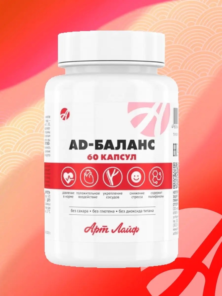АД-баланс (AD-баланс) - препарат нового поколения, предназначенный для нормализации сосудистого тонуса, микроциркуляции за счет улучшения капиллярного кровообращения, клеточного дыхания. Его прием предупреждает кислородную недостаточность в любой ткани и органе, обеспечивает питание и снабжение кислородом сердечной мышцы, укрепляет сосудистую стенку.Рекомендуется для профилактики и лечения в составе комплексной терапии гипертонической болезни I и II степени, вегето-сосудистой дистонии, реабилитации больных после инсультов и инфарктов, профилактики людей группы риска. К группе риска возникновения гипертонической болезни относят людей имеющих ожирение, вредные привычки, наследственную предрасположенность, повышенный уровень холестерина, возраст старше 40 лет, а также лица, постоянно испытывающие стресс (руководители, педагоги, работники сферы обслуживания и т.п.). Как вспомогательное средство БАД «АD-Баланс» применяют при всех заболеваниях и состояниях, связанных с нарушением кровообращения и повышенным артериальным давлением. Препарат рекомендован спортсменам и людям с повышенной физической нагрузкой для улучшения снабжения мышечной ткани кислородом и профилактики гипертонии, вызванной повышенными нагрузками. Продукт представляет собой комплексную биологически активную добавку. Ее компоненты нормализуют все звенья регуляции АД в организме: как центральные, находящиеся в головном мозге, так и периферические, зависящие от тонуса сосудов и давления крови на их стенки. Активные компоненты лекарственного растительного сырья не вызывает слишком сильного падения артериального давления при приёме препарата, поэтому возможно применение его как профилактического средства даже при нормальном артериальном давлении. При регулярном применении АД-баланс способствует нормализации функций нервной системы, обладая антистрессовым и успокаивающим действием. Также продукт обладает высоким антиоксидантным действием, кроме того, позволяет предотвратить развитие атеросклероза сосудов, который является одной из причин гипертонии. Комплекс АД Баланс на сегодняшний день не имеет аналогов на рынке БАД в России. Эффективный препарат создан на основе хорошо зарекомендовавших себя растительных экстрактов и инновационного комплекса Винитрокс. Фруктовые полифенолы из винограда и яблок, входящие в комплекс, усиливают выработку оксида азота и таким образом оказывают сосудорасширяющее действие. В результате Винитрокс снижает давление и способствует улучшению кровоснабжения органов и мышечной ткани, обеспечивая их кислородом и питанием. Калий и экстракт хвоща, входящие в АД-баланс, помогают избежать ненужной задержки жидкости в тканях. На этом фоне ускоряется непосредственное расслабляющее действие магния на стенки сосудов, а также экстрактов пустырника и цимицифуги, устраняющих избыточное возбуждение центров регуляции АД, находящихся в головном мозге. Оздоровлению сосудистого русла и нормализации его тонуса способствуют экстракты аронии, шлемника байкальского и гинкго билобы. Арония интересна тем, что является одним из самых сильных в природе средств, нормализующих АД и при этом оказывающих мощное противовоспалительное действие внутри сосудистого русла. Шлемник и гинкго не только стабилизируют АД, но и улучшают 