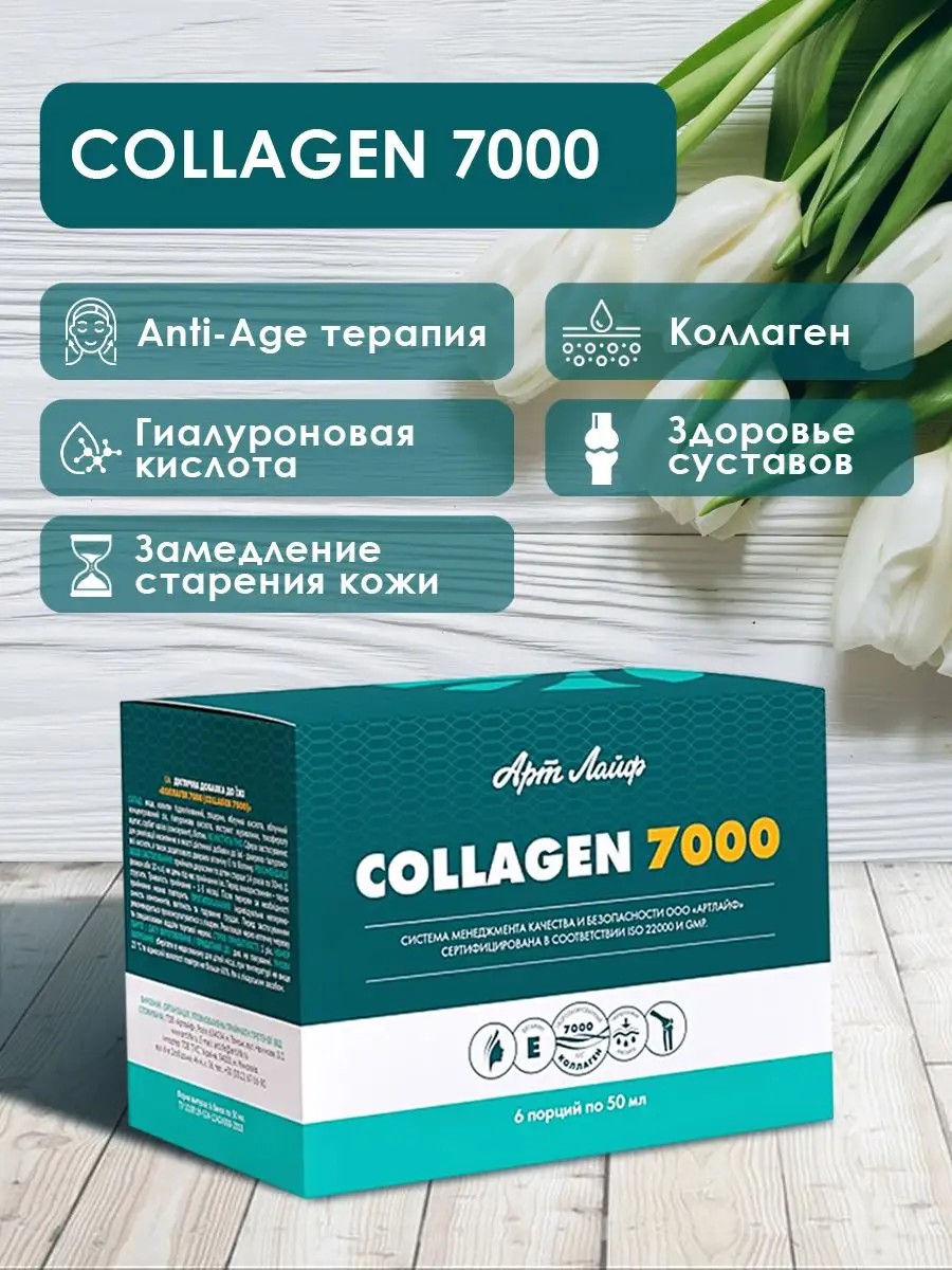 Коллаген "7000" 6 флаконов по 50 мл — питьевой коллаген с гиалуроновой кислотой, биотином и витамином Е. Витаминный комплекс отличается повышенным содержанием гидролизата коллагена (7 000 мг), обеспечивает: ●гладкость и упругость кожи;●укрепление связочного аппарата и хрящевой ткани;●образование сети волокон для кальция;●укрепление костей;●повышение упругости, стимуляция роста волос и ногтей;●образование новых мышечных волокон;●поддержание периодонтальной связки;●восстановление эластичности стенок сосудов;●нормализация артериального давления. коллаген для суставов: польза для глаз Биологически активная добавка с витамином Е отличается пользой для глаз благодаря входящей в состав гиалуроновой кислоты. Природный компонент снижает утомляемость глазного яблока, сохраняет влажность конъюнктивы даже при длительной работе за монитором. Важно отметить и улучшение дренажной функции организма, защиту от повреждающего действия свободных радикалов, усиление репаративной функции (ускоряет заживление тканей). БАД для укрепления организма.Коллаген 7000 — комплекс компонентов, чье уникальное действие на организм обусловлено инновационным подходом и новейшими разработками при создании данного препарата. В комплекс входят коллаген гидролизованный, гиалуроновая кислота, витамин Е, биотин.